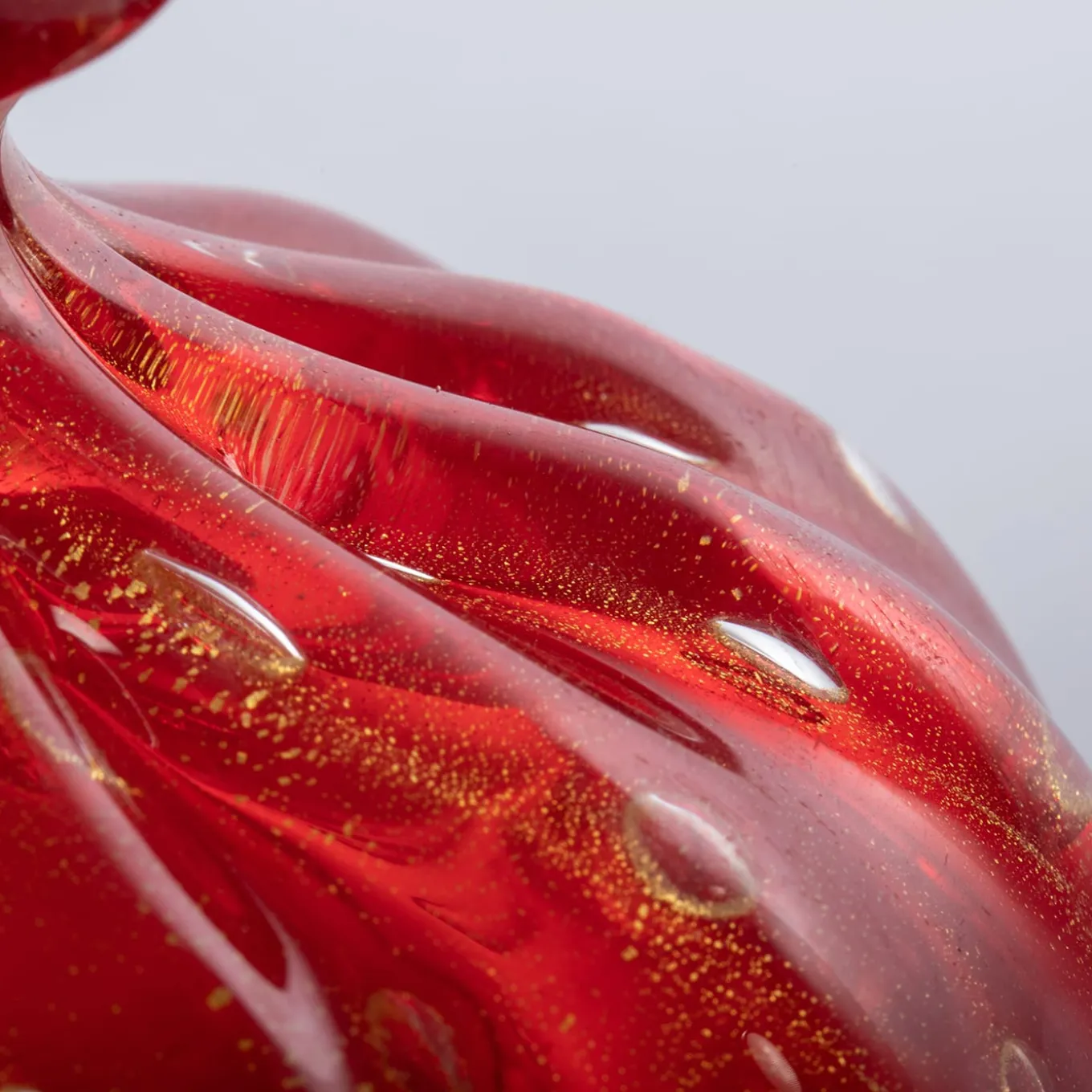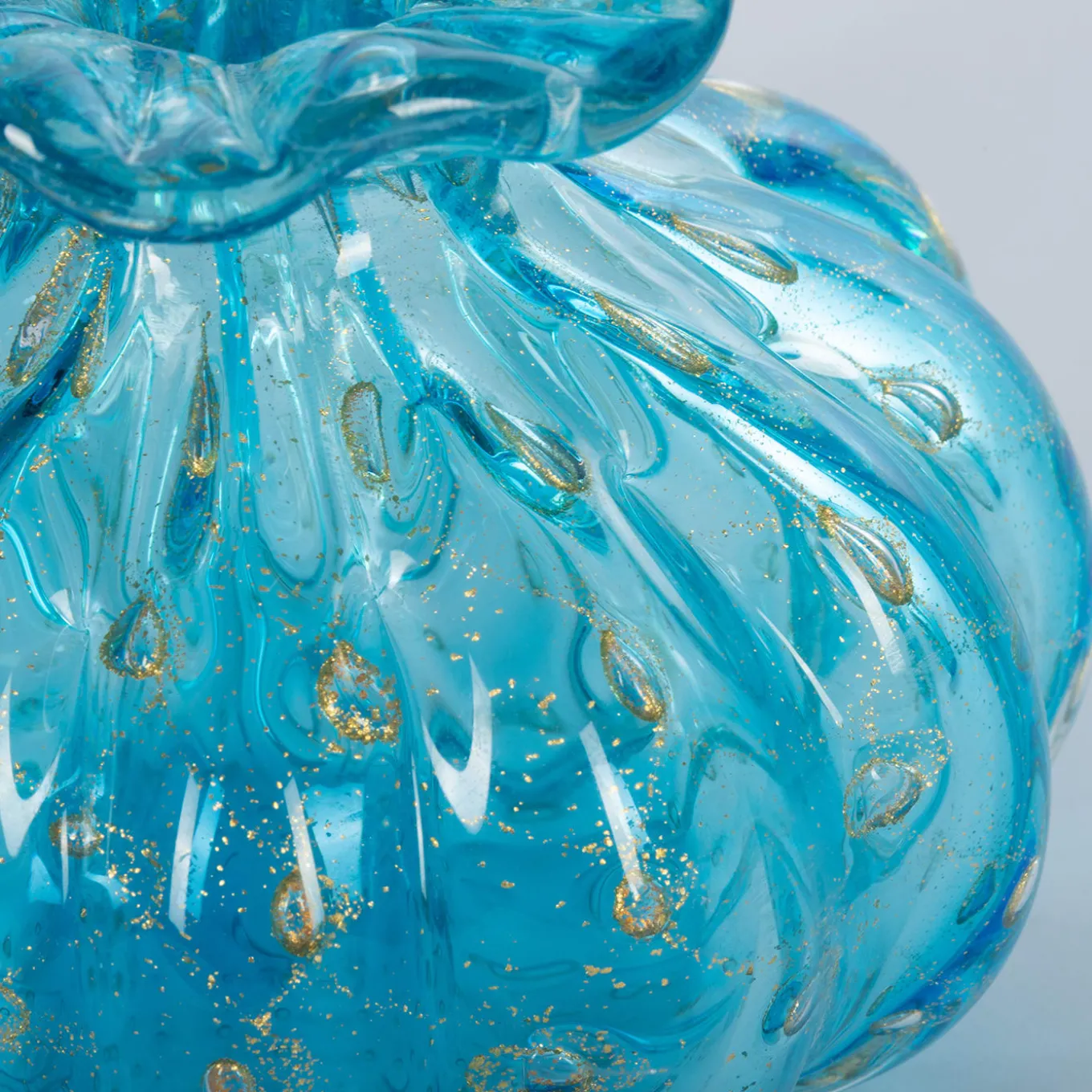 Poetic characteristic pooling together the three tiny vases composing this set is the presence of air bubbles trapped within the glass coupled with specks of 24K gold. Their flounced design was achieved by following the traditional balloton technique, typical of Murano mouth-blown masterpieces since ancient times. Offered in a dark-amber, red, and a light-blue version, they can also be used as a container for home fragrances to be diffused with reeds.