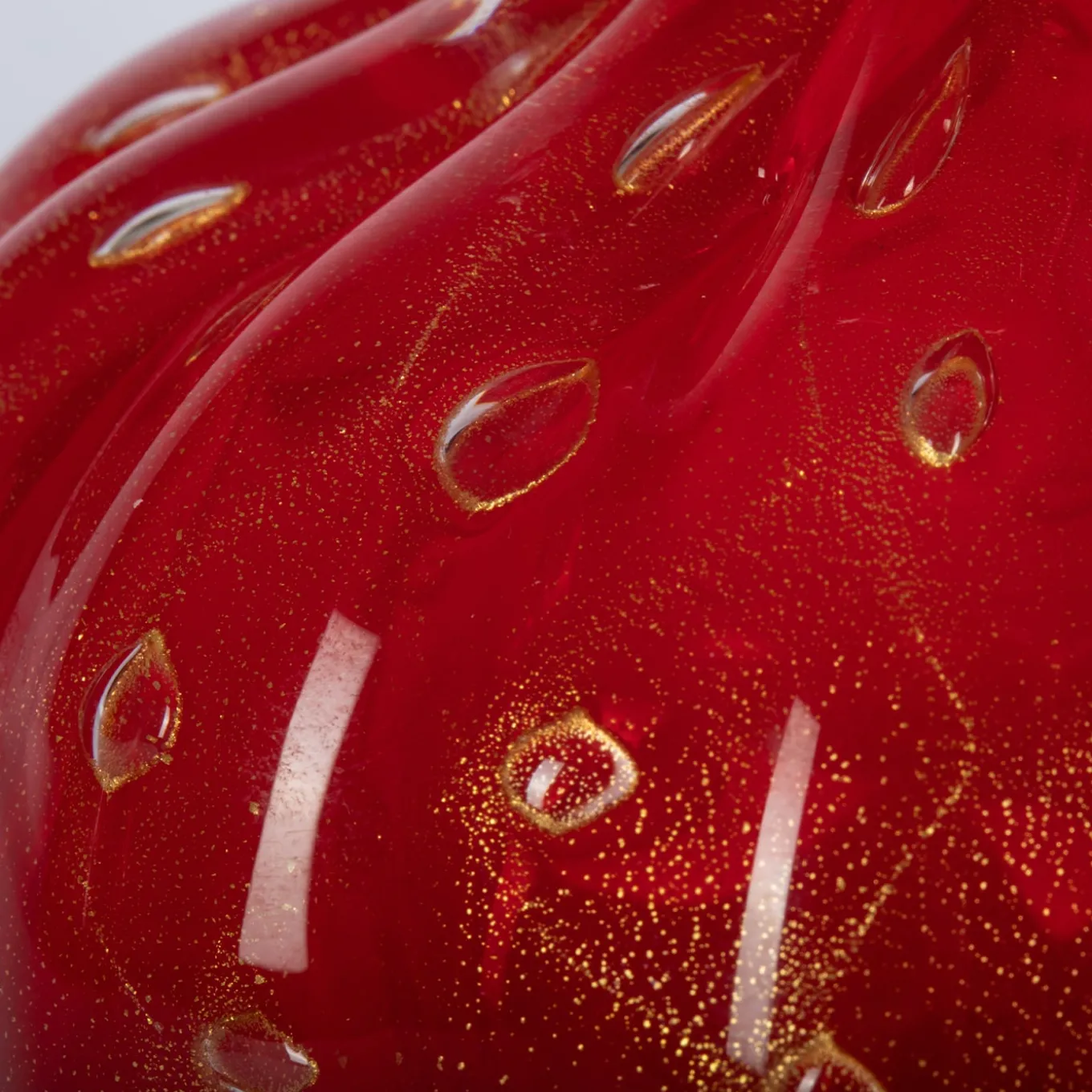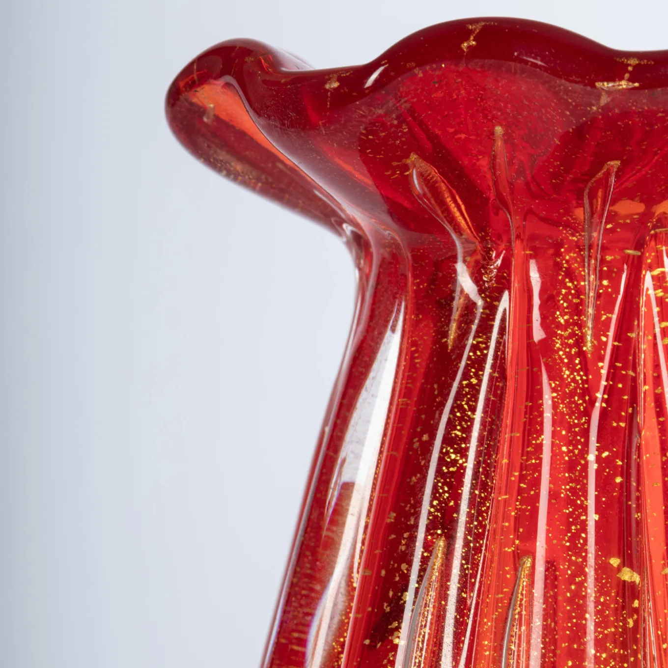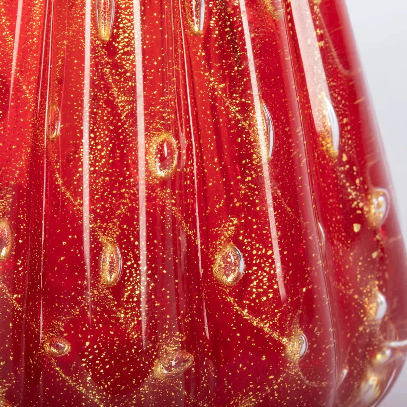 This set of three vases in assorted sizes (cm 13x18H, 10x14H, and 12x10H) flaunts a striking design where glassblowing artistry, opulence, and glamour beautifully converge. Their characteristic flounced texture – obtained as a result of the traditional balloton technique – amplifies the shimmering quality of the 24K gold specks trapped within the glass also surrounding the air bubbles to accent their decorative value.