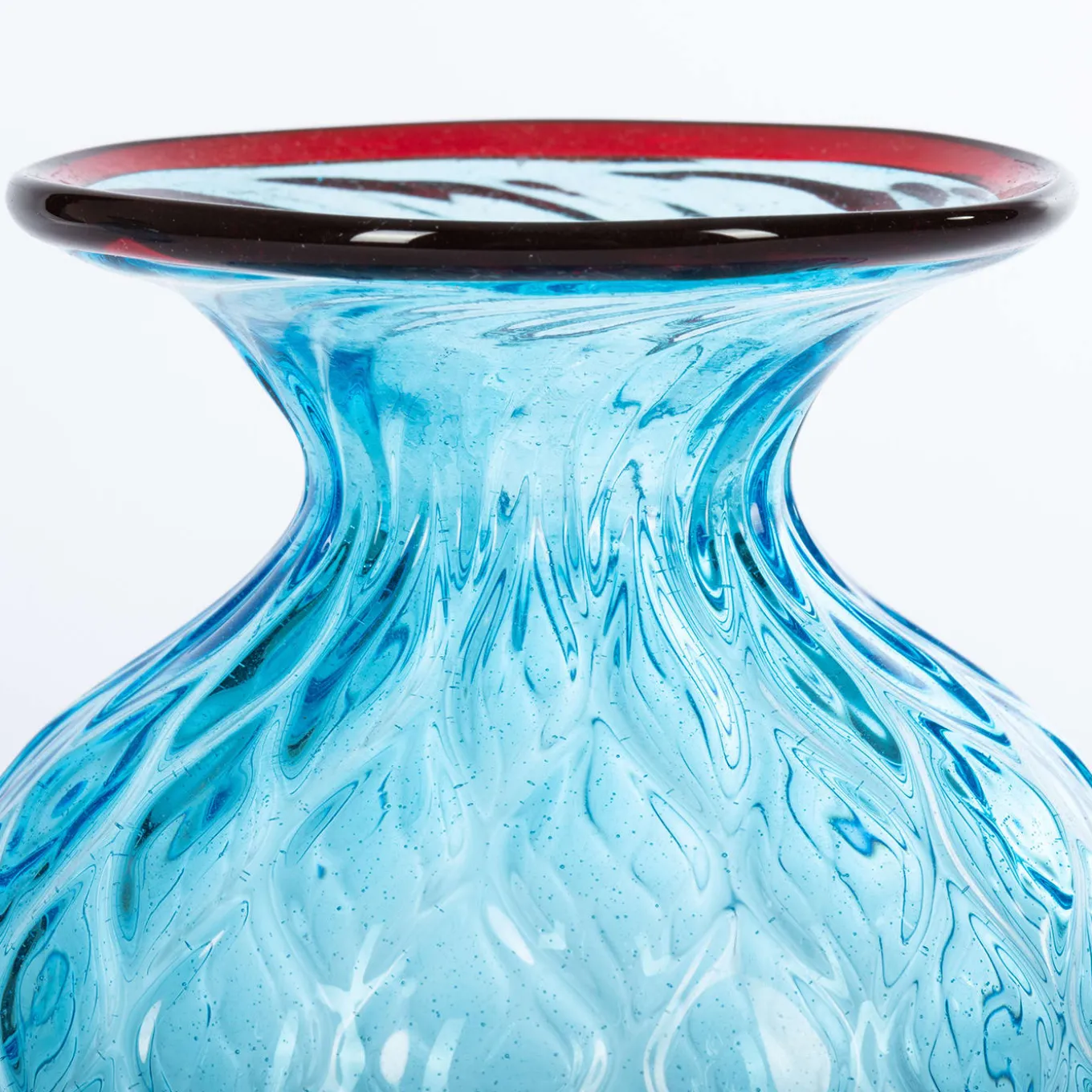 This remarkable vase mouth-blown from light-blue Murano glass embodies centuries of glassblowing tradition within a simple, fresh design that well adapts to modern contexts. Topped by a burgundy rim, the sinuous body boasts an appealing diamond texture obtained with the balloton technique and lends the vase an extraordinary reflective quality allowing it to captivate even as a purely decorative piece.