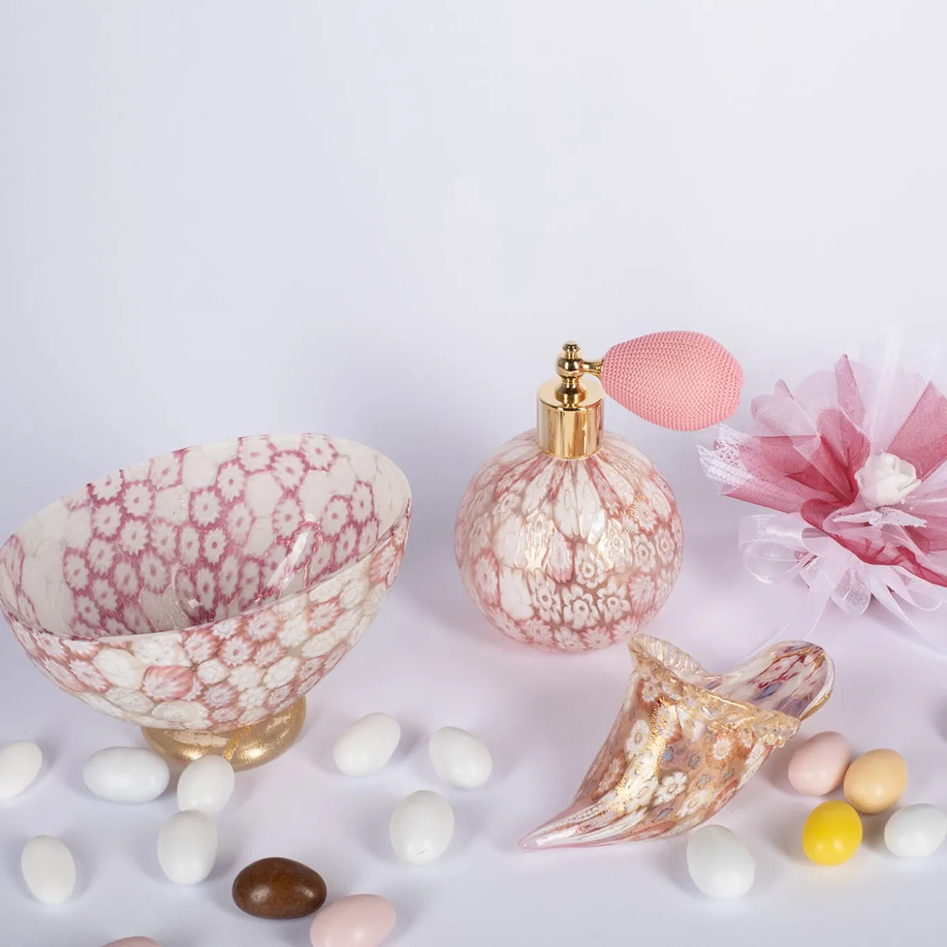 A delicate and sophisticated pink perfume bottle with a matching atomizer, that will enhance any dressing table and may also be used to contain a unique air freshener in a living area. Crafted using the murrine technique, and enhanced by 24kt gold leaf decorative motif, it is a remarkably chic way to encapsulate the most elegant of fragrances.