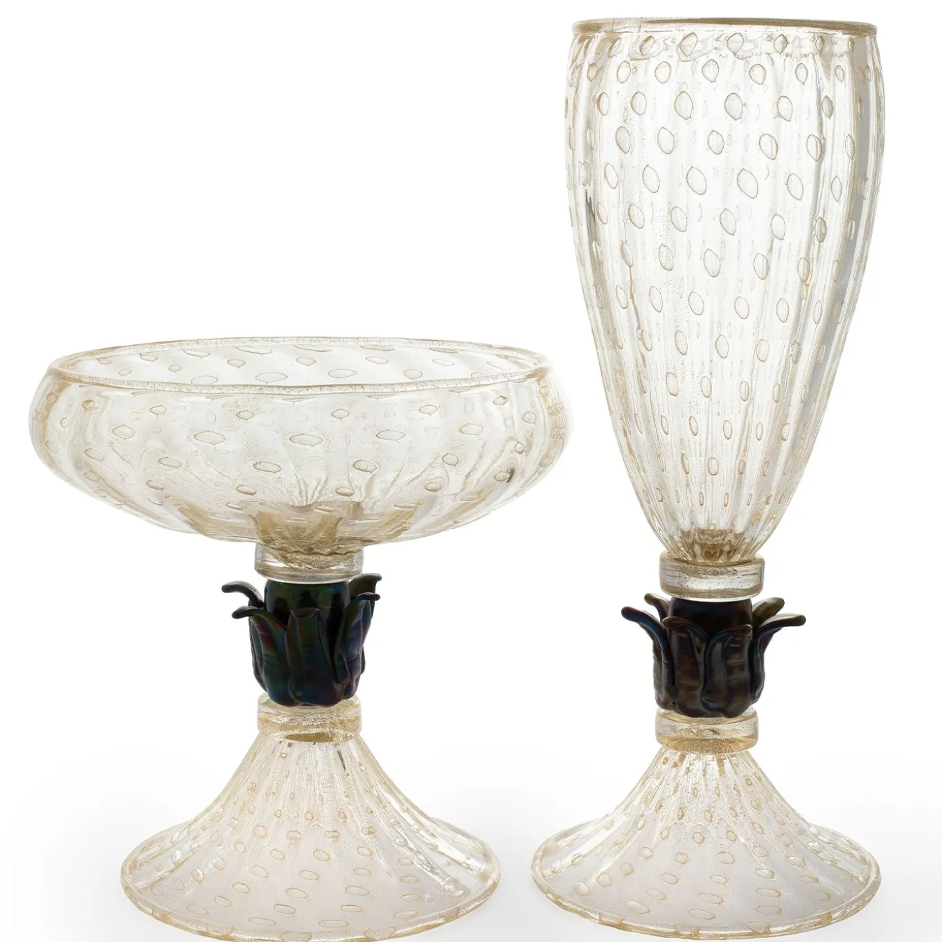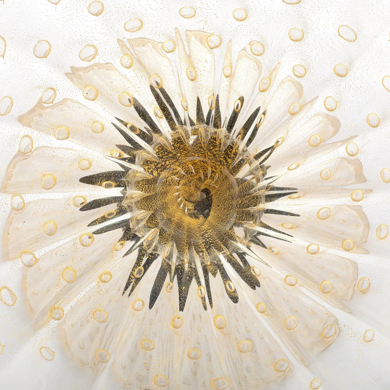 Painstakingly mouth-blown by a renowned master glassmaker in Murano, this footed crystal bowl makes for a superb and plush addition to classic or modern decors. A black element surrounded by seeming petals adorn the center, contrasting with the rest of the soft-golden crystal enriched with air bubbles and 24K gold specks. An authenticity certificate is included with purchase.
