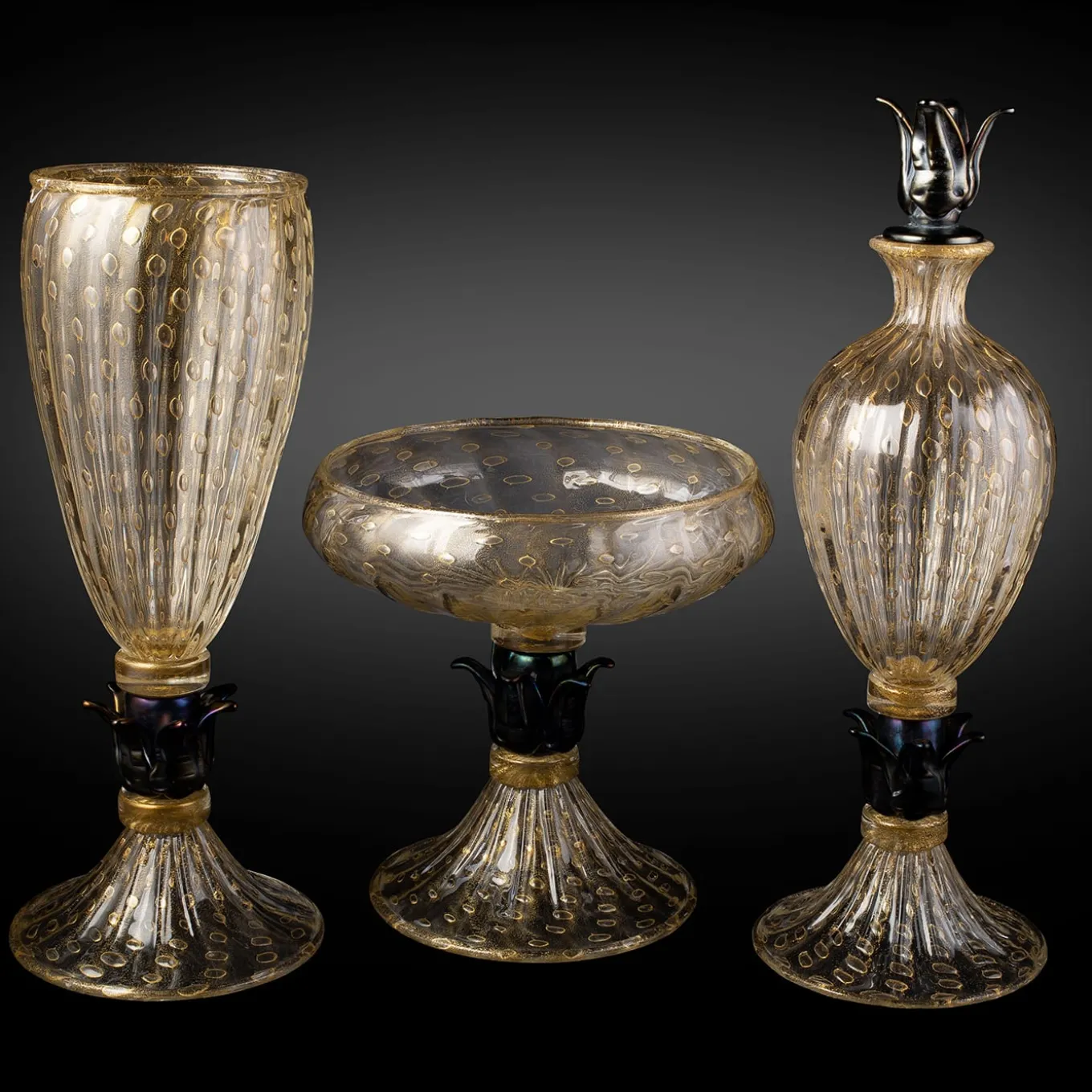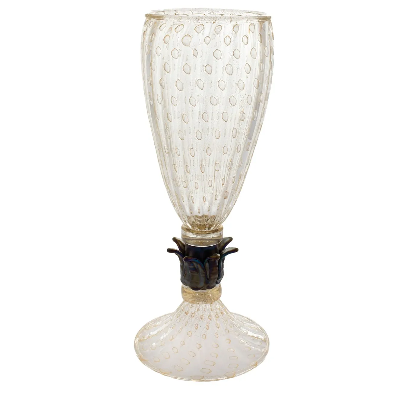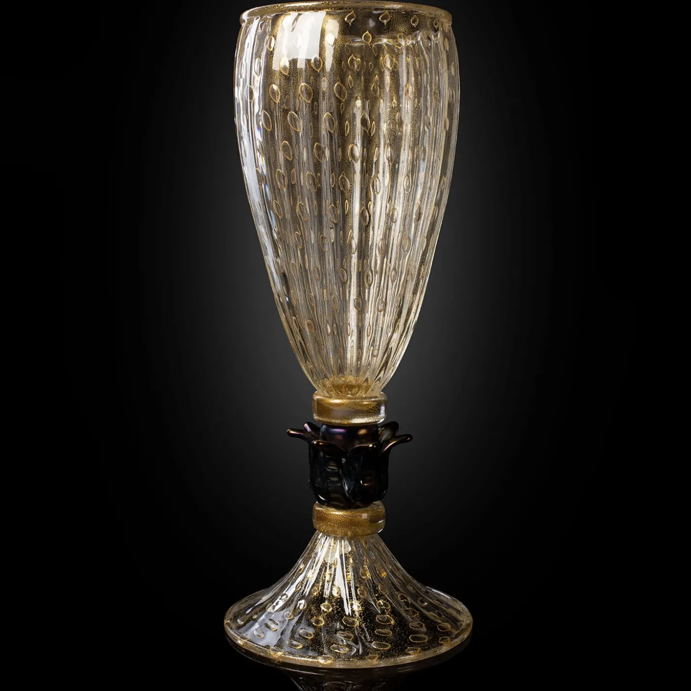 This superb footed vase is an original creation by a renowned Muranese master glassmaker. Blown from prized crystal and enriched with air bubbles and 24K gold specks trapped within, the bowl and trumpet base are jointed by means of a black glass element completed by petal-like protruding elements. An authenticity certificate is supplied with purchase.