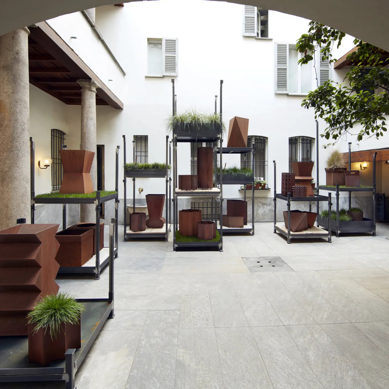 The irregular perimeter of this elegant iron vase holder with no bottom is ideal to host two or three small plants. Every piece is welled with an artisanal method to create a one-of-a-kind object. The surface is finished with a treatment that allows a thin layer of rust to deposit and create hues and nuances unique to each piece that oxidizes and changes color in time. The metal naturally releases particles that can be visible on light or porous surfaces.