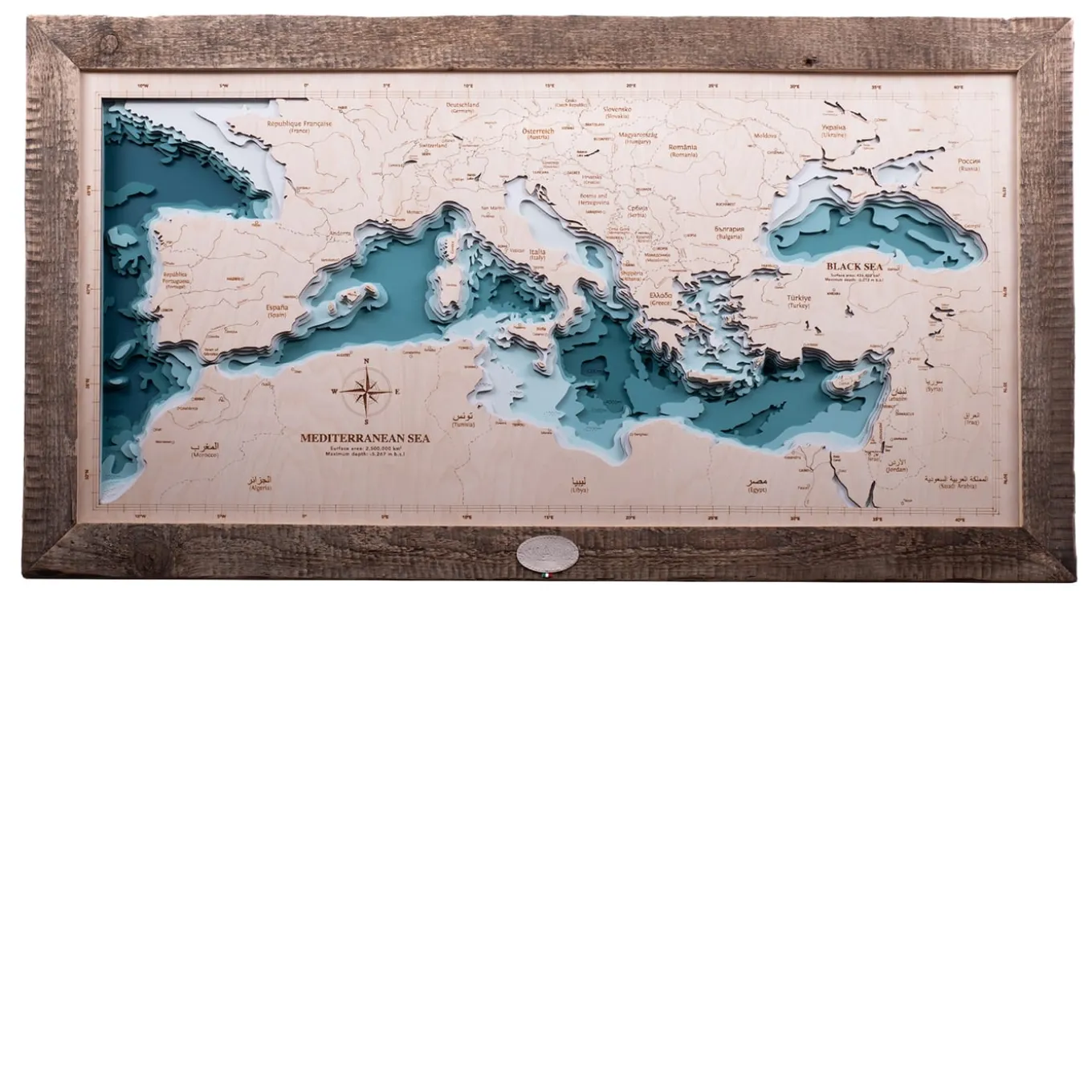A three-dimensional representation of the Mediterranean Sea, this gorgeous design will make an elegant and sophisticated addition to a contemporary-style decor. Enclosed in a wooden frame, it showcases splendidly handcrafted details. Please consult the Concierge for further information on materials and techniques of craftsmanship.