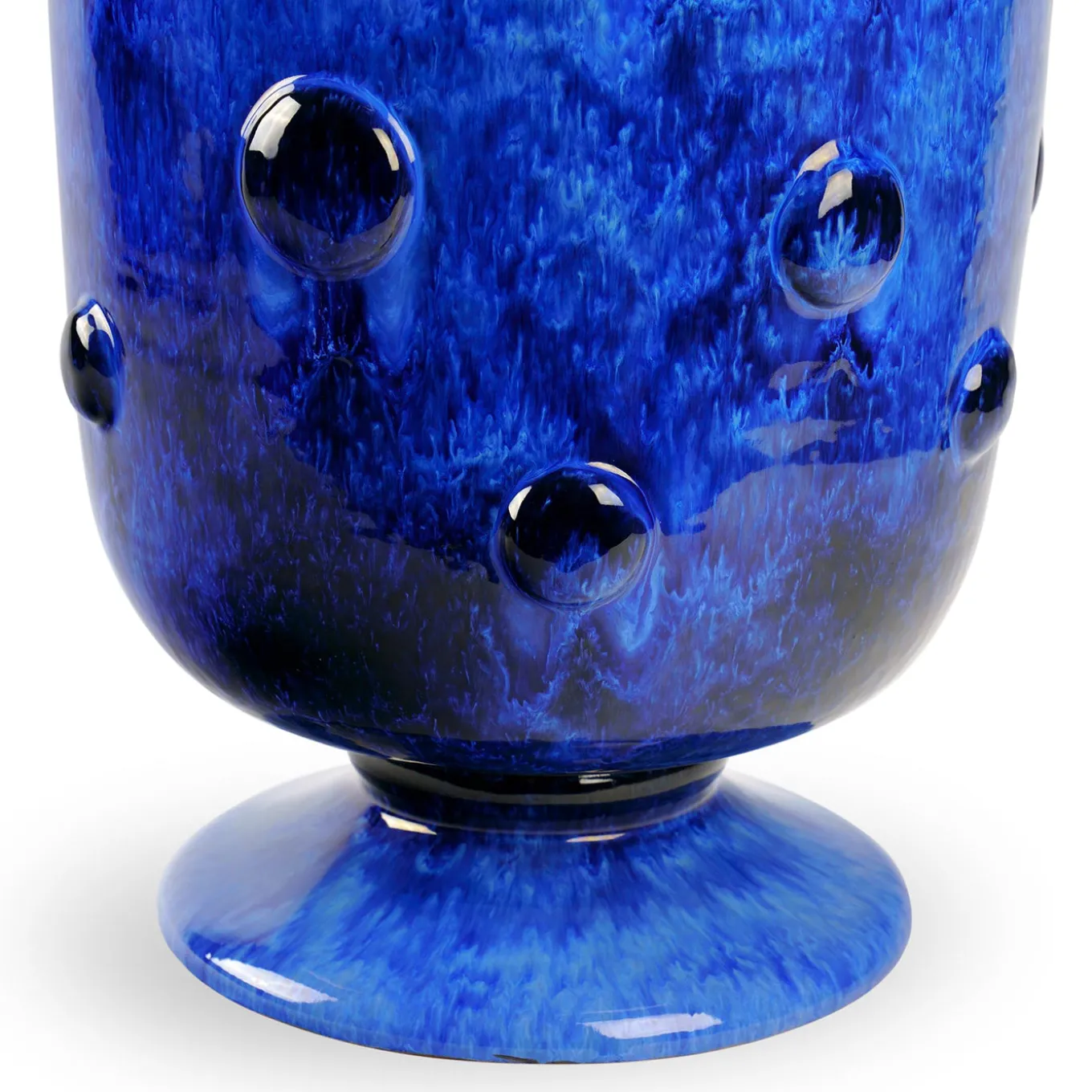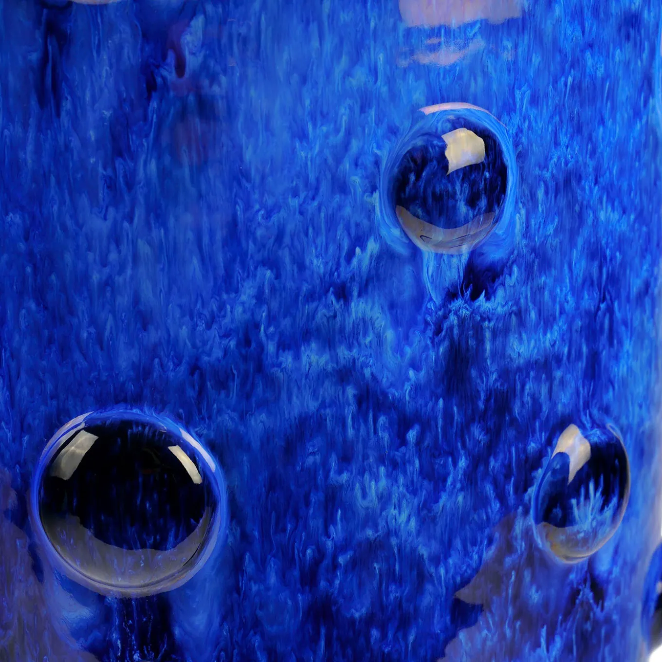 The Abisso vase features a rich deep blue finish with a high-gloss surface contrasted by tactile, bubble-like protrusions that create an organic texture. Its hand-turned form includes delicate ridges and an elegant flared rim, adding to its visual depth and presence. Each piece showcases slight variations in color and detail, reflecting unique artisanal craftsmanship and offering a striking, bold accent for any interior setting.