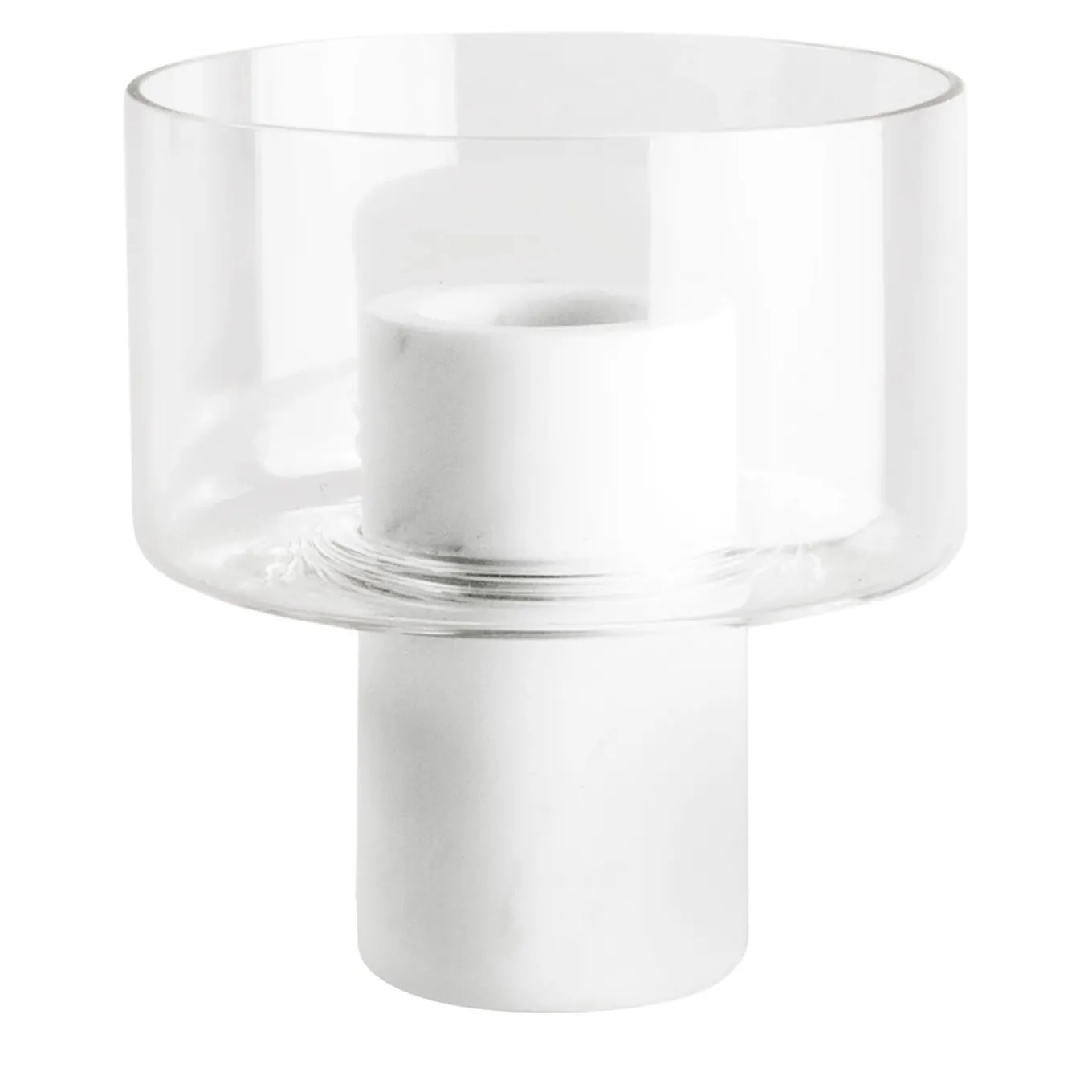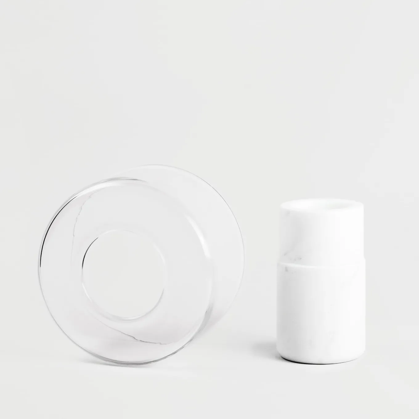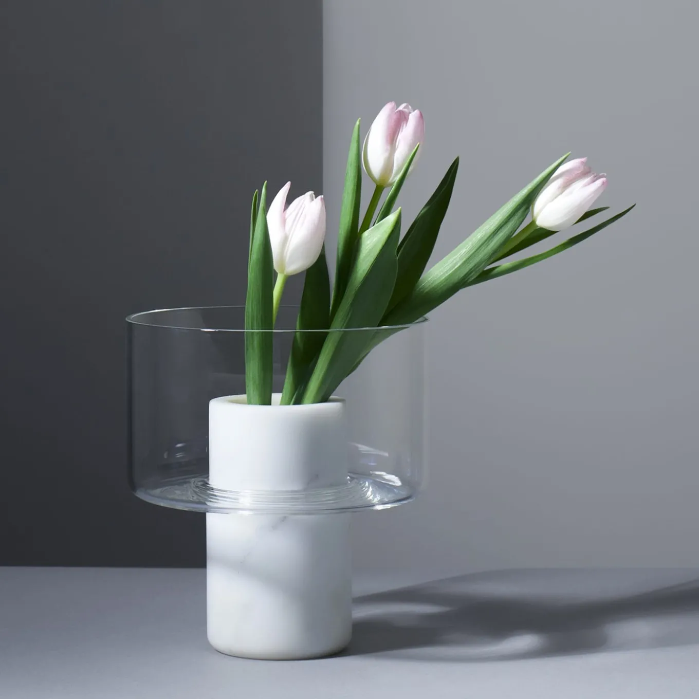 A one-of-a-kind testament to Made in Italy design, this splendid glass and Statuario marble vase will add a sleek and sophisticated accent to contemporary interior decors. The slender and delicate Borosilicate glass upper part harmoniously contrasts with the sturdy marble base, shaping an exquisitely layered silhouette conceived as floral clothing. Other versions are available in the Artemest catalog.