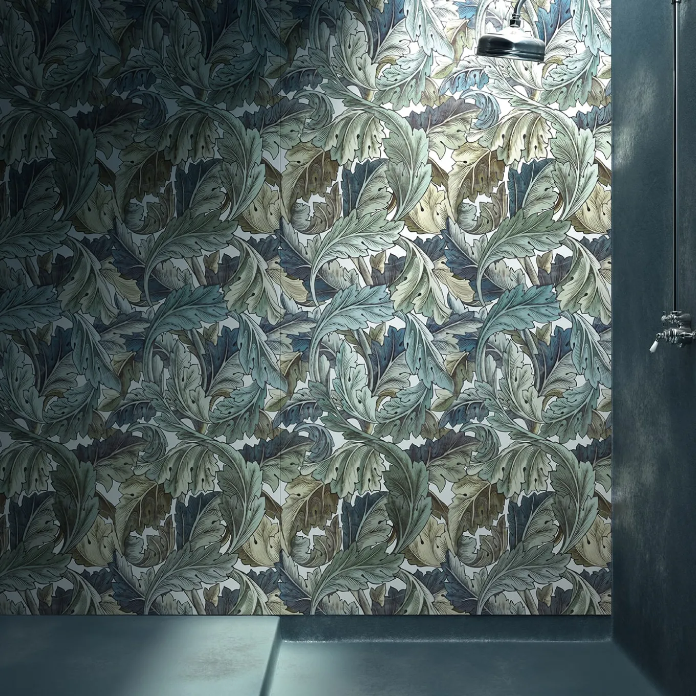 Pricing is per square meter. A collection of large ceramic slabs with an extraordinary visual effect, characterized by a surprising synthesis of aesthetic refinement and practicality. The two motifs are classic: the original revisitation of acanthus and the Art Deco stylization of peacock feathers, having refined golden patterns made with pure gold. Please, contact the Concierge for further information.