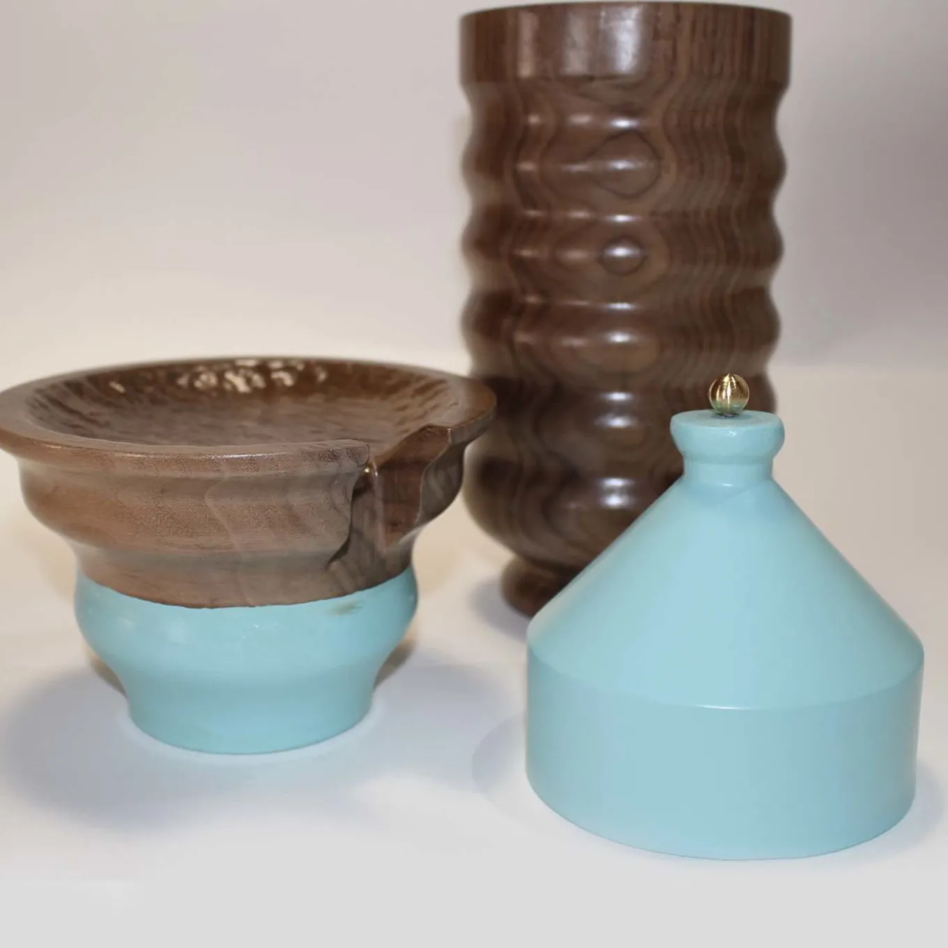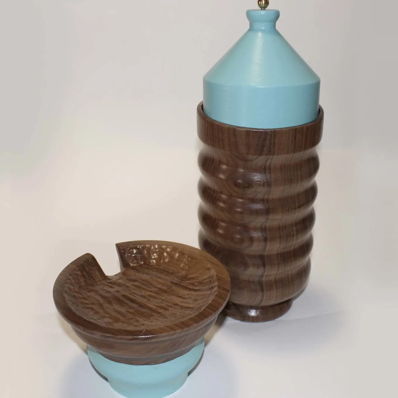 Featuring a lovely bottle shape decorated with textural details, this sculptural-inspired design brings artful style and elegance to any interior. Handcrafted of lathe-turned walnut and finished with a protective water-based, non-toxic coating, this decorative set comprises two pieces: a footed shallow bowl, and a tall bottle with an undulated body, both accented with a turquoise detail at the bottom and top, respectively. A stunning gift on any special occasion, this elegant design will add an exclusive touch in a contemporary or rustic living room or entryway.