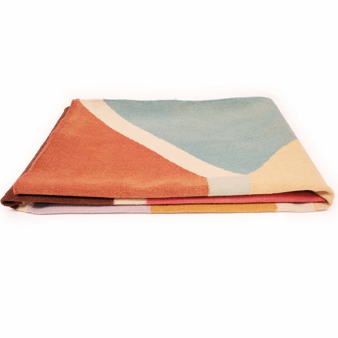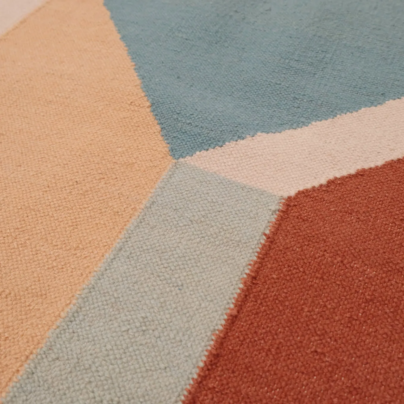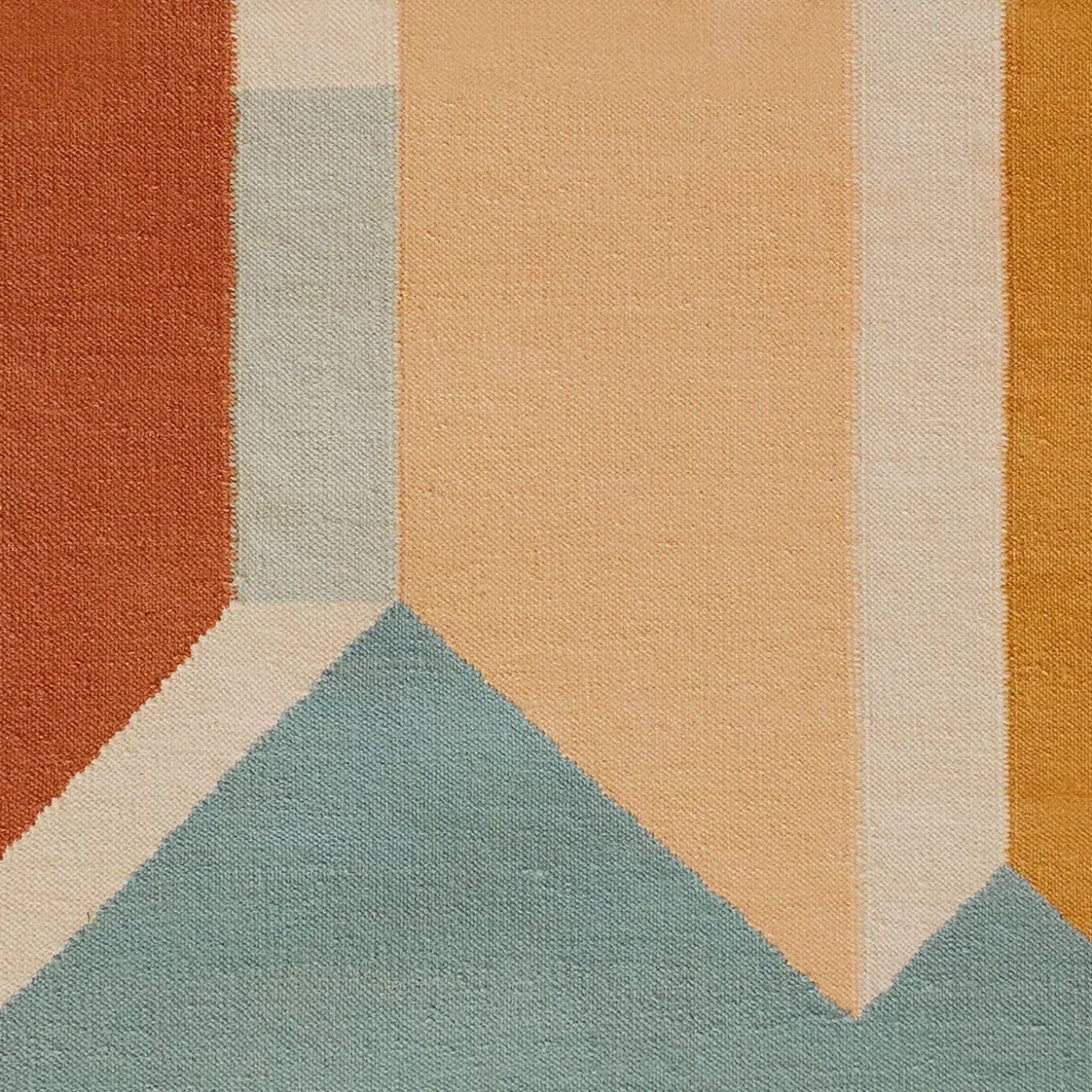 This carpet shows a unique compostion of geometric shapes. The pattern is enhanced by earthy tones that remind the hues of the sunset. The dreamy architecture represented on the wool carpet creates and elegant element for any interior space.