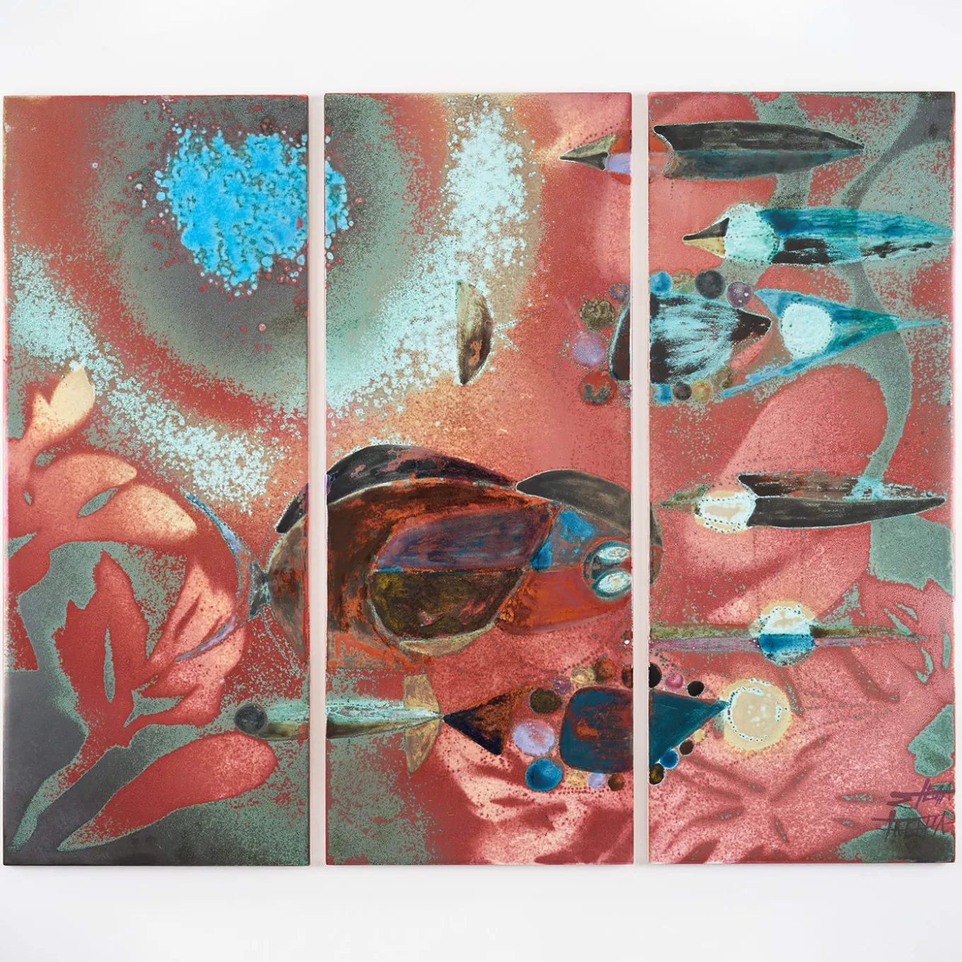 A triptych composed of three stunning hand-decorated faience tiles, this decorative panel actualizes the synthesis of three generations of artists. Decorations by Carla Lega perfect the colors and the idea that Martina Scarpa developed by drawings by Leandro Lega, resulting in an oneiric underwater glimpse that, thanks to the second reduction firing, lends the oxides and enamels a striking iridescent quality. Each piece boasts unpredictable details.