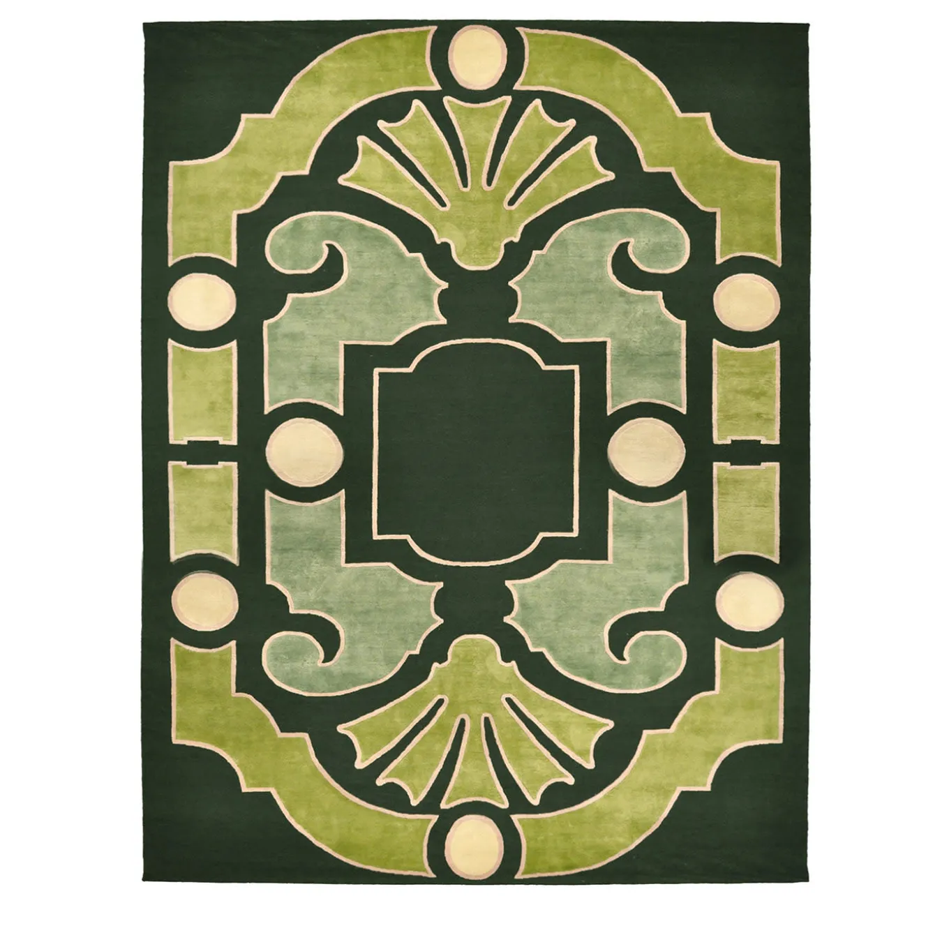 Alexandrine is one of the vibrant designer rugs designed by Samuele Mazza as part of Sahrai’s Designer’s Selection Collection. A classic pattern in varying shades of green with symmetrical elements mirroring each other and creating a beautiful harmony of colors and shapes. Please, contact the Concierge for further information.