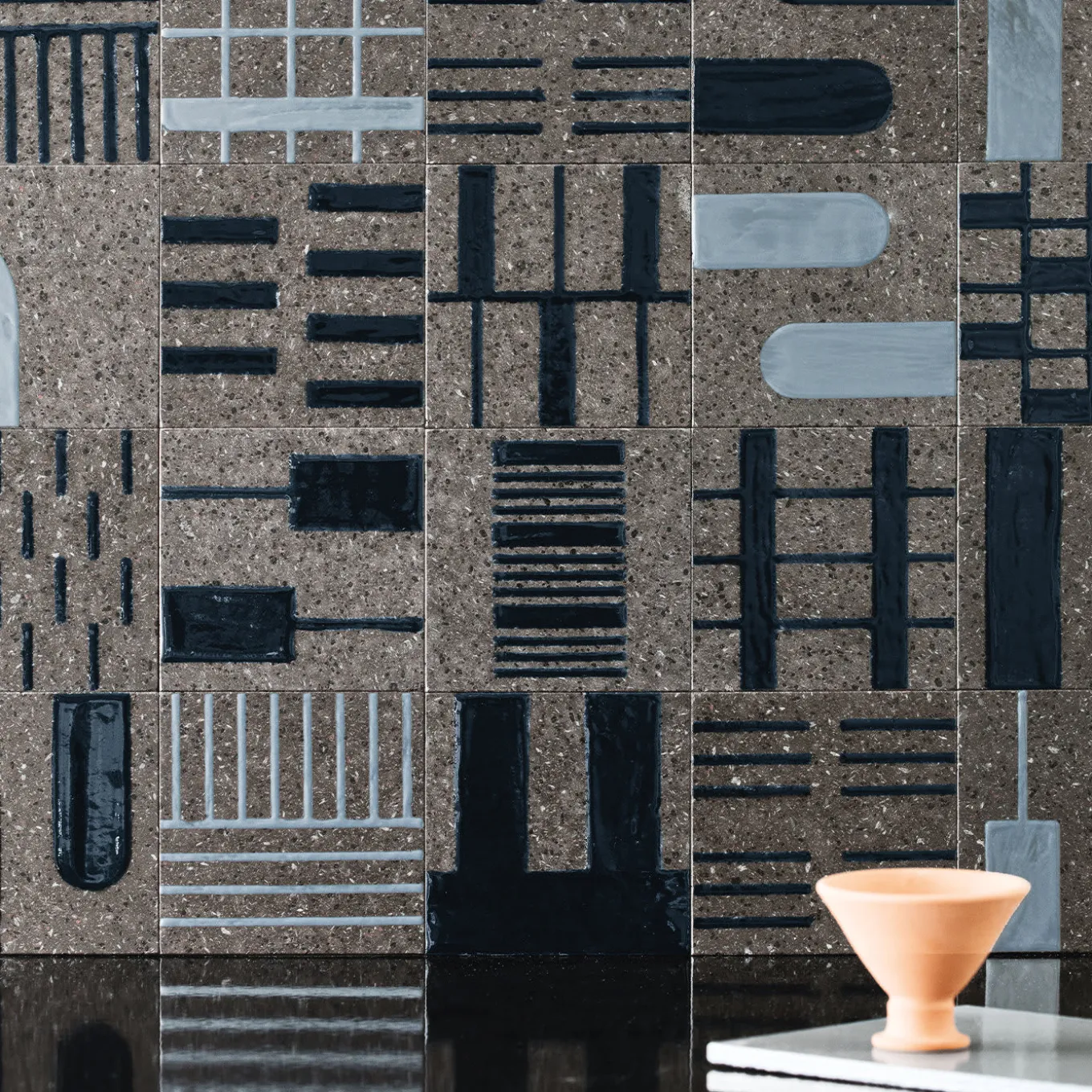 Handcrafted by masters Nicolò and Fausto Parrinello from authentic lava stone from the Etna volcano, this set counts 44 tiles (15x15cm) that will bring a true piece of Sicily into any interior. Geometric-inspired decorations in azure and midnight-blue glazes stand against the stone, a motif painted by hand and indeed naturally unique. The set withstands jumps in temperature and impacts.