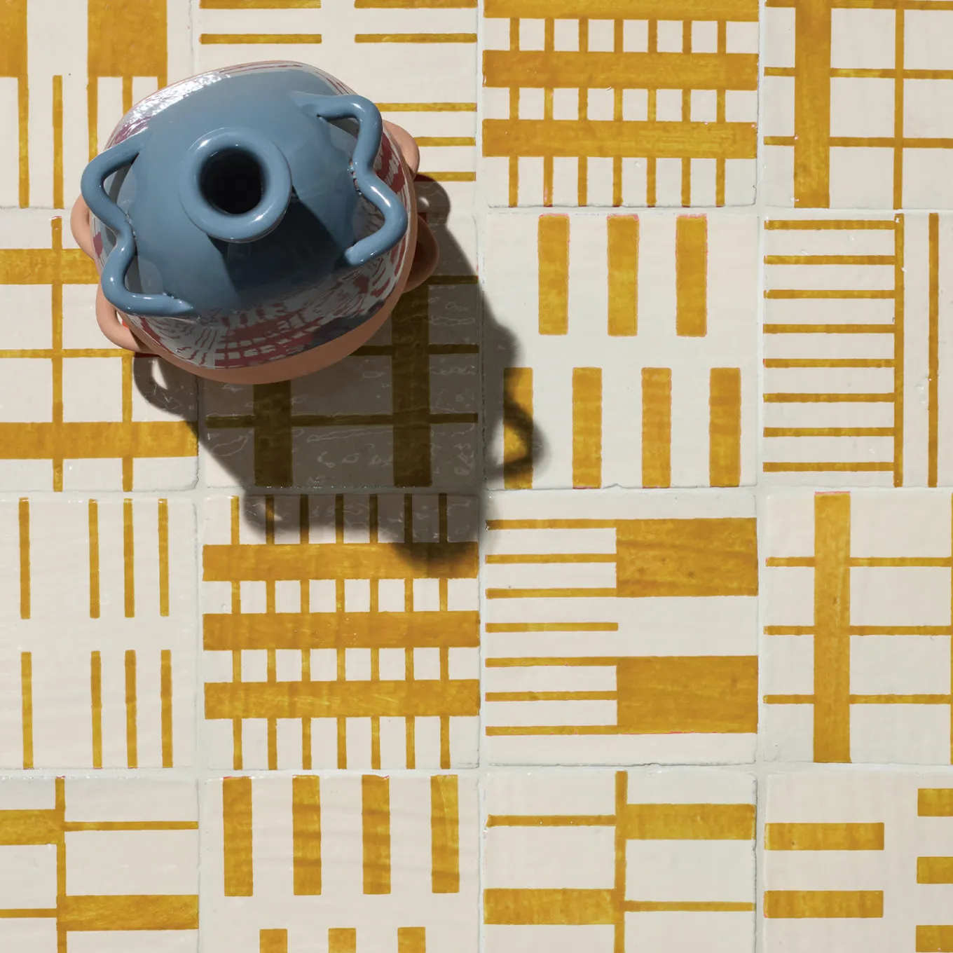 Designed by Margherita Rui, this set of 44 ceramic tiles boasts a manual decoration that emerges from cream-white glaze in its assorted motifs painted with mustard brushstrokes. Masters Nicolò and Fausto Parrinello craft each tile by hand in Caltagirone, Sicily, a manual process that implies the singularity of every single piece. The set covers one square meter.
