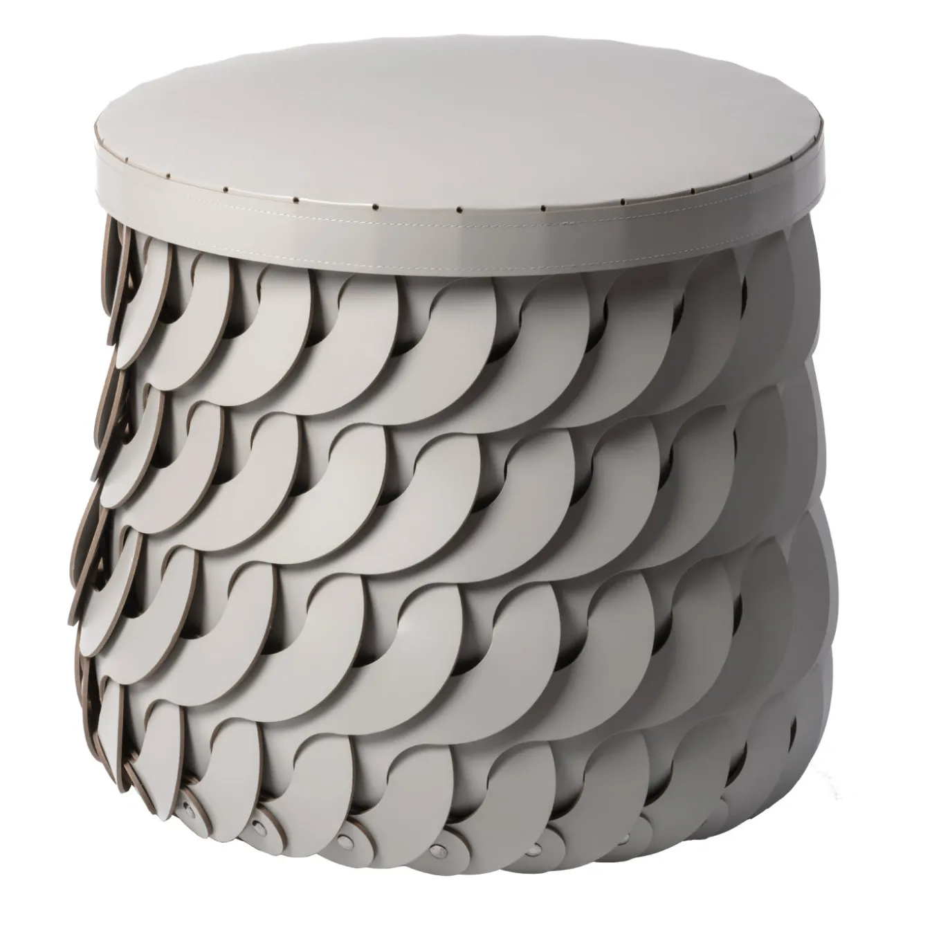 Blurring the boundaries between traditional craftsmanship and contemporary design, this stylish basket with lid is the essence of functional decor. The round frame is woven of S-shaped gray leather strips. Suitable also for outdoors, this piece is available in other colors and sizes.