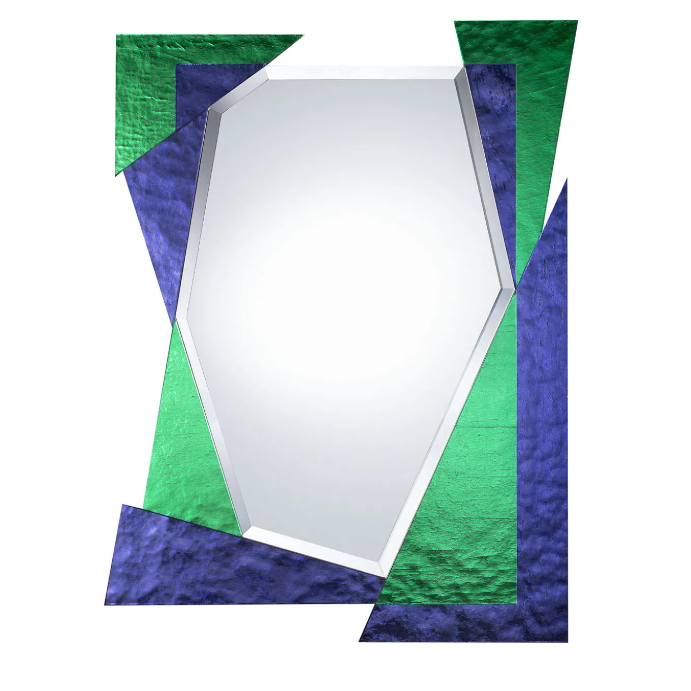 The Alise’ wall mirror, made in collaboration with artist Sara Forte, features an irregular polygonal central mirror framed by uniquely textured blue and green glass sheets. Crafted using a specialized rolling technique, these plates exhibit natural imperfections and variations in texture, ensuring each piece remains distinct. The artisan silvering of the glass panes enhances the dynamic interplay of light and color, making it a striking addition to contemporary interiors. One-of-a-kind piece.