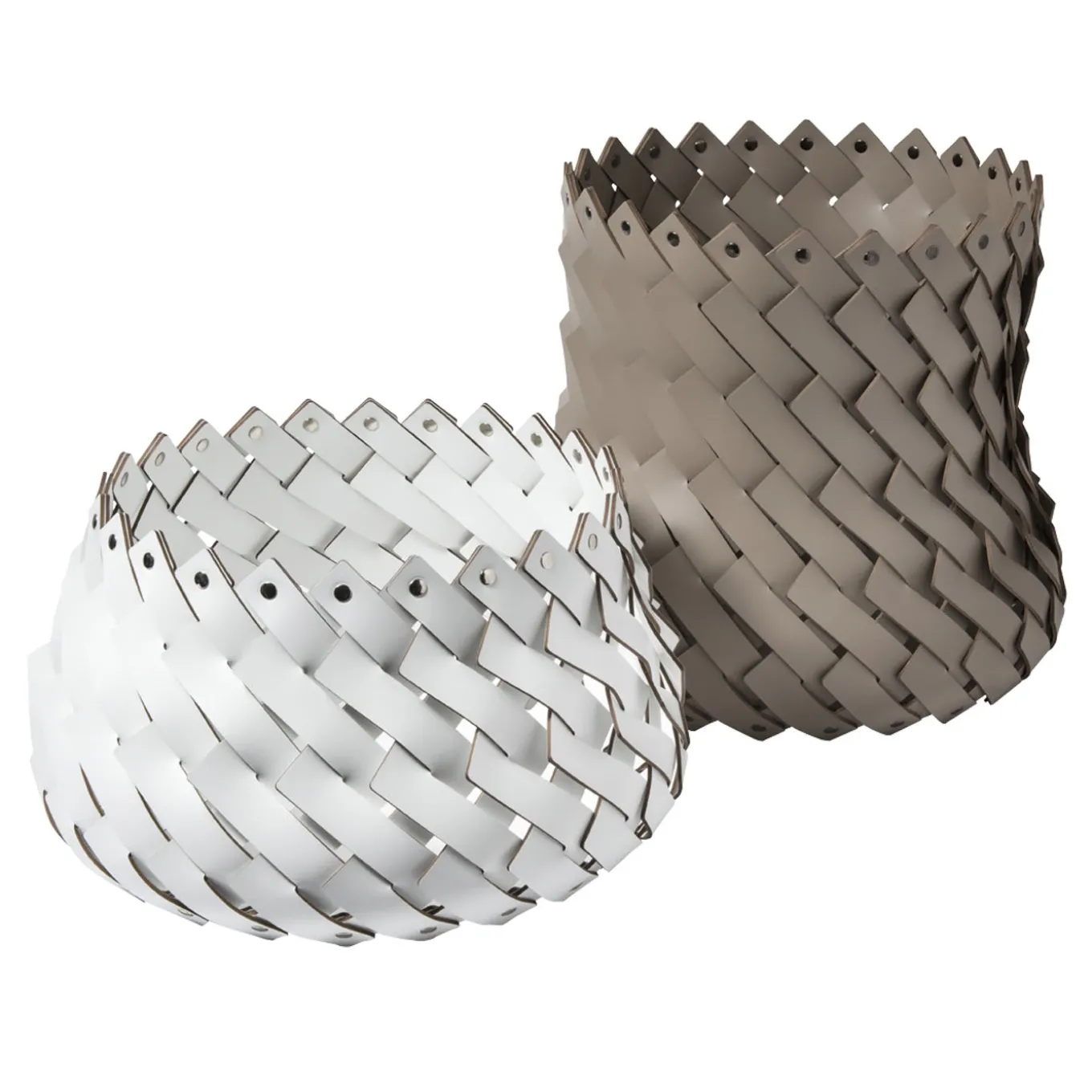 Part of the iconic Almeria Collection by Pinetti, this superb basket in cream eco-friendly leather has a low yet generous shape that will lend a unique texture to any interior. Entirely woven by hand, the strips form a diagonal design and are fixed on top with polished chrome studs, with intersecting lines and jagged-shaped rim creating an alluring visual effect. Functional and elegant, this basket can be used virtually anywhere at home, and it is suitable also for outdoor use. It is available in other Antibes colors -with a neutral palette. Please contact the Concierge for details.