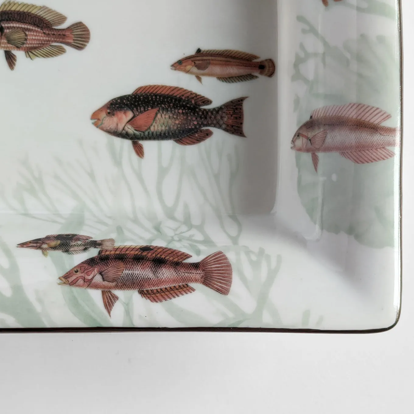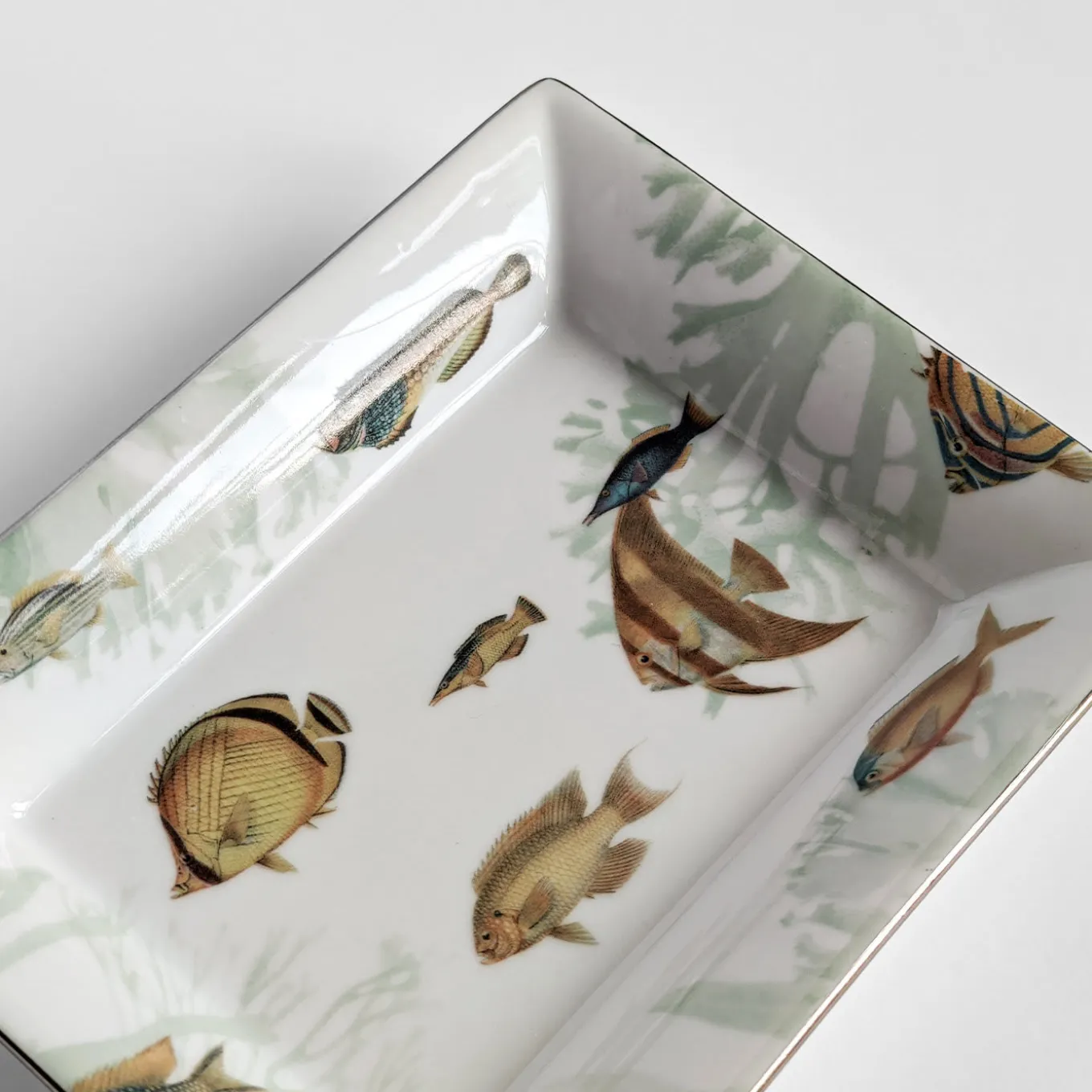 This splendid set of an ashtray and coordinated vide-poche in fine white porcelain will make for a spot-on housewarming gift for coastal homes. Inspired by the coral reef of the Amami Islands in Japan, the set depicts colorful fish rendered in exquisite details set against a background of gray-hued seaweed. The ashtray measures cm 15 x 11.5 x 2.5 H, while the vide-poche measures cm 19.5 x 16 x 4 H.