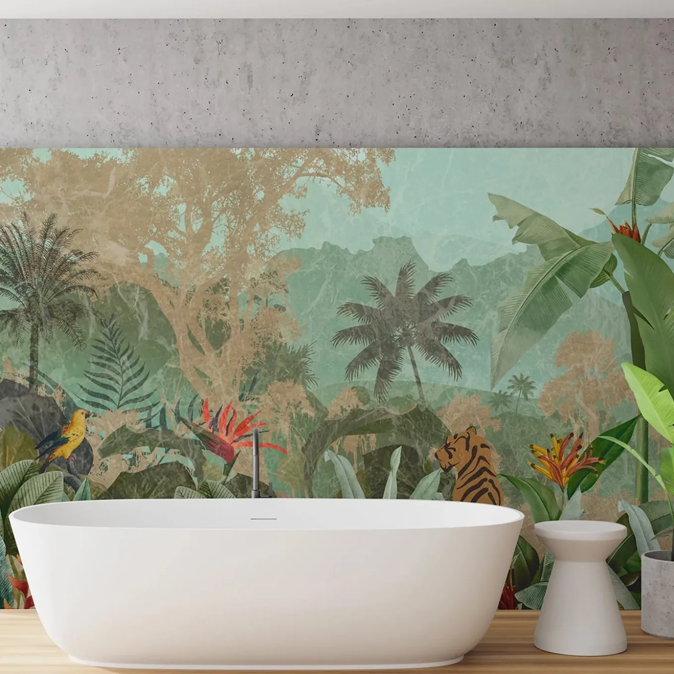 An inebriating triumph of colors allowing the lush flora and fauna to emerge from the background defines this splendid wallpaper, part of the Panorama Collection and fashioned from sustainable, PVC-free, and top-quality paper. Also available in variants printed on Kerlite® and thin fiberglass panels, the design will offer the surprising feeling of being immersed in the Amazonian forest by simply looking at it. Price is per squared meter.
