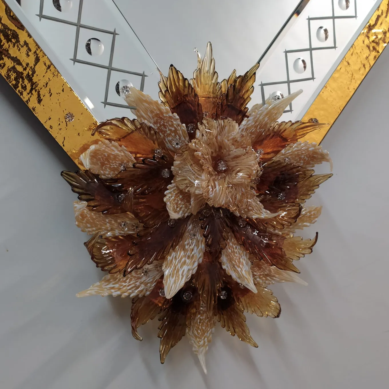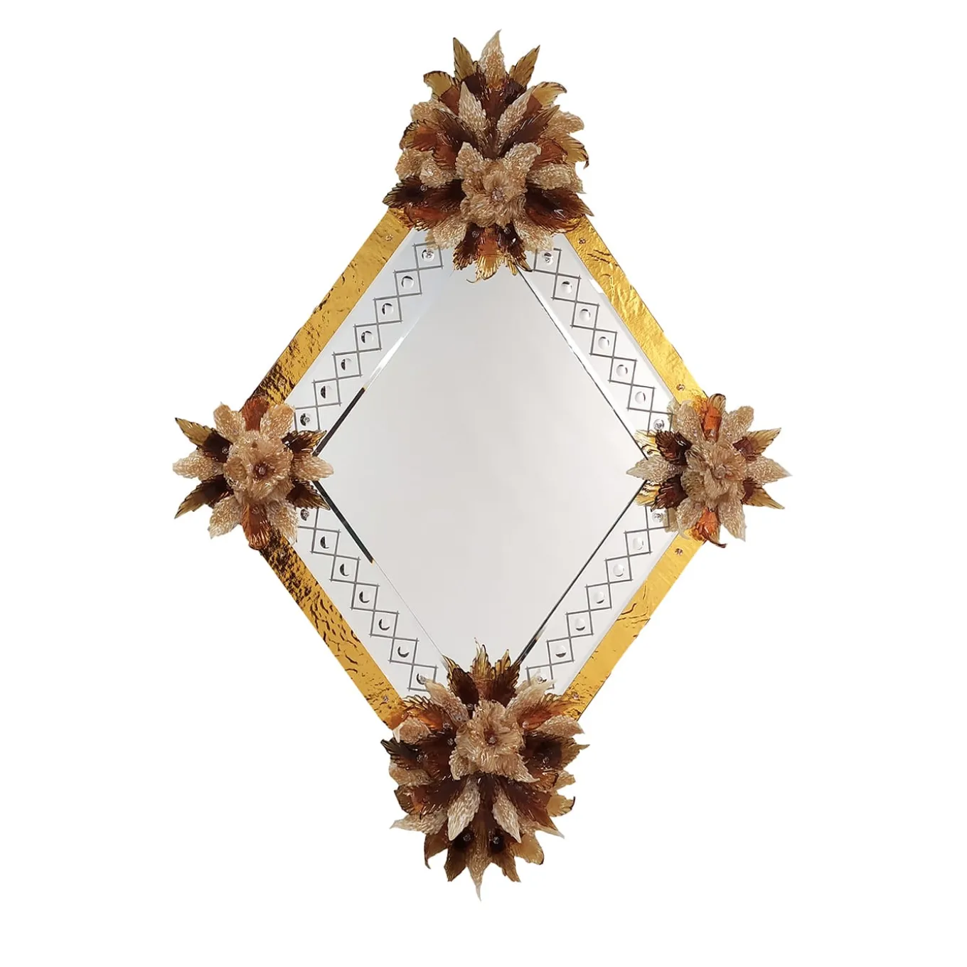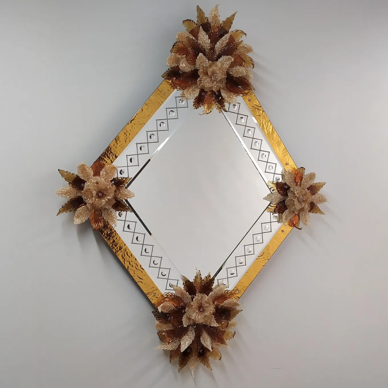 Bold and sophisticated, this Murano glass mirror transforms any space with its warm golden glow. The hand-cut geometric frame shimmers with silver leaf detailing, while delicate glass flowers add a touch of organic beauty. A fusion of tradition and modern luxury, this piece by Fratelli Tosi is perfect for those who appreciate fine craftsmanship and want to bring an opulent, Venetian-inspired statement into their home.
