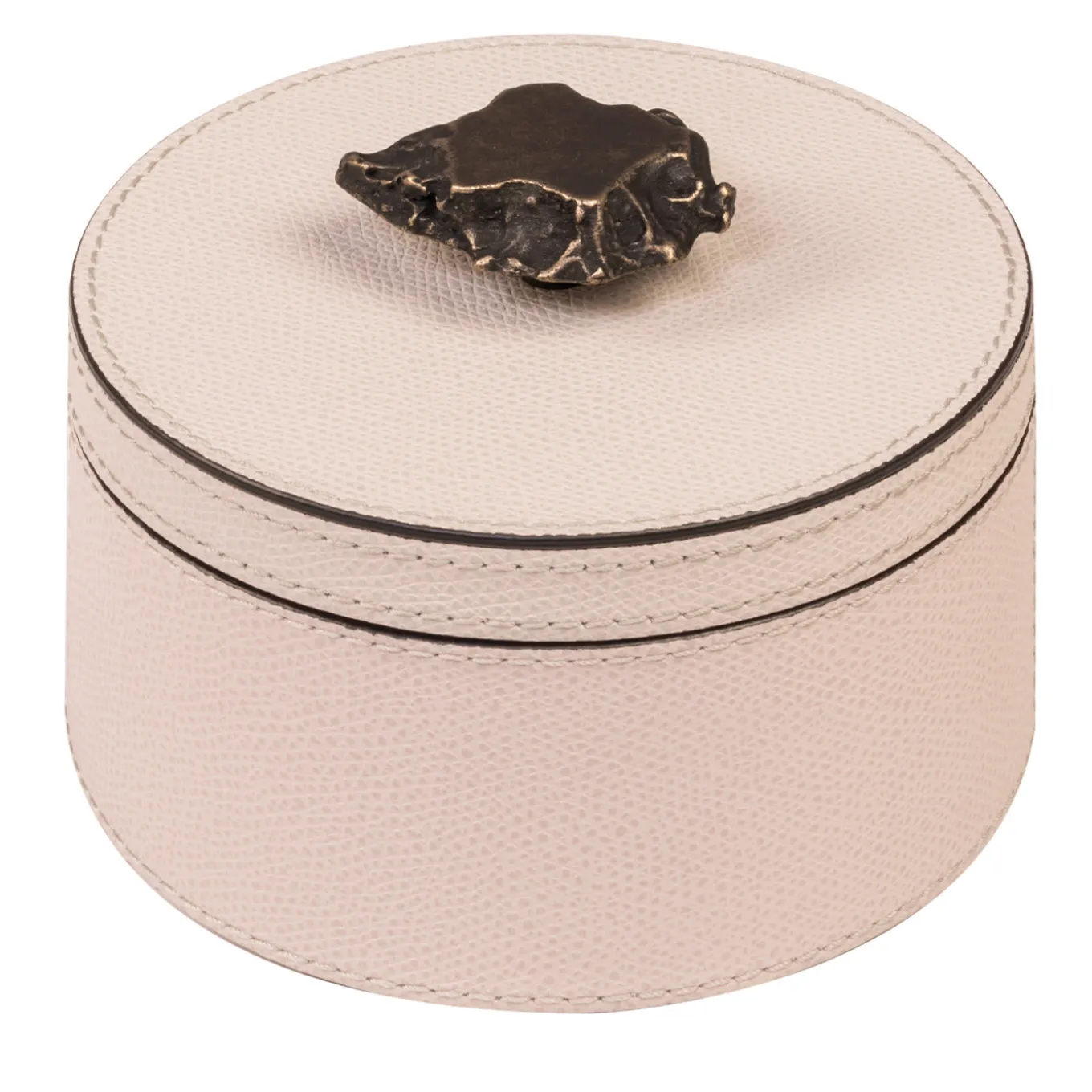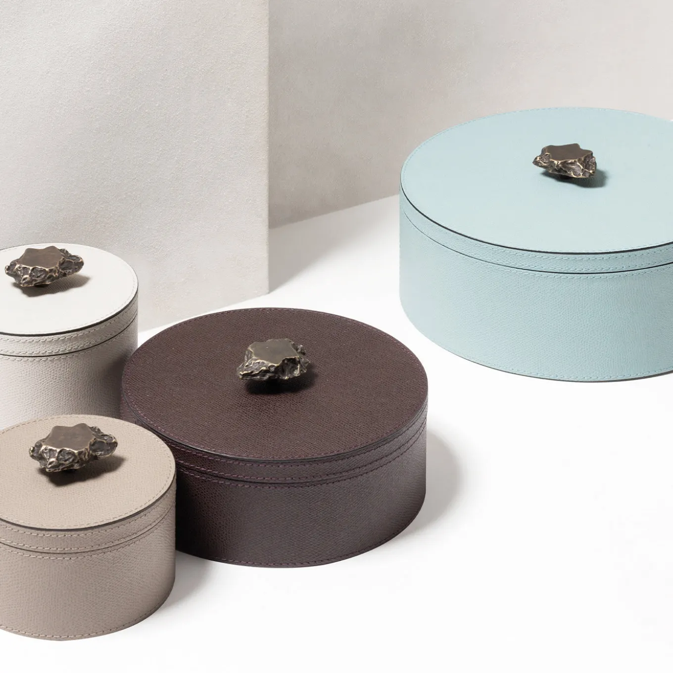 A piece of pristine sophistication, this exclusive suede-covered box of the Ambretta Collection is available in several colors and three shapes. Featured in a delicate ivory color with black piping, the removable lid features a knob handcrafted of bronze-finished metal, a glamorous detail revealing the masterful eye for details that distinguishes Giobagnara’s exclusive creations.