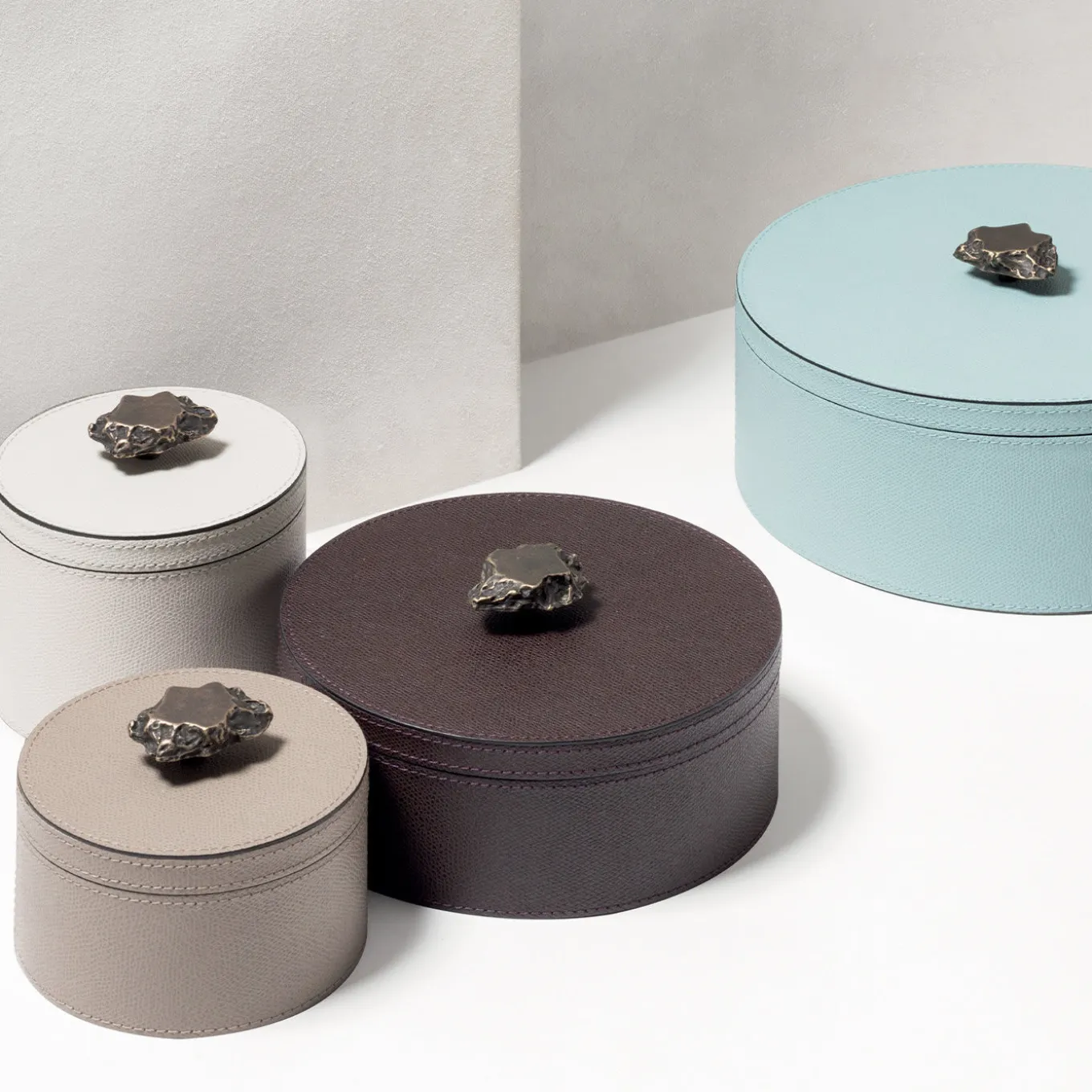 This elegant box is a glamorous accent piece that effortlessly blends form and function. Wrapped in soft ivory suede with black piping, the removable lid boasts a bronze-finished metal handle, the recurrent motif of the Ambretta Collection. Best showcased on a console, desk, or side table to store valuables and trinkets, this box is available in a wide range of catalog colors and thee sizes.