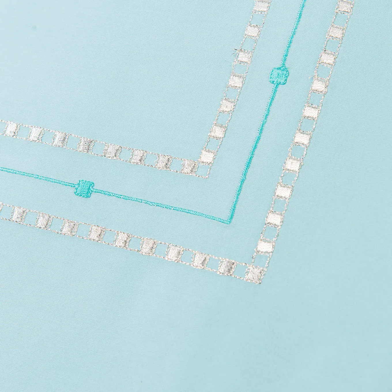 Add a serene touch to your bedding with the Ametista flat sheet, measuring 270x300cm. Made from 300-thread-count cotton, it features elegant satin embroidery in a soothing light blue hue. This generously sized sheet provides a luxurious, soft feel while complementing both modern and classic interiors. Perfect for layering, it blends functionality with timeless sophistication for a refined bedroom aesthetic.