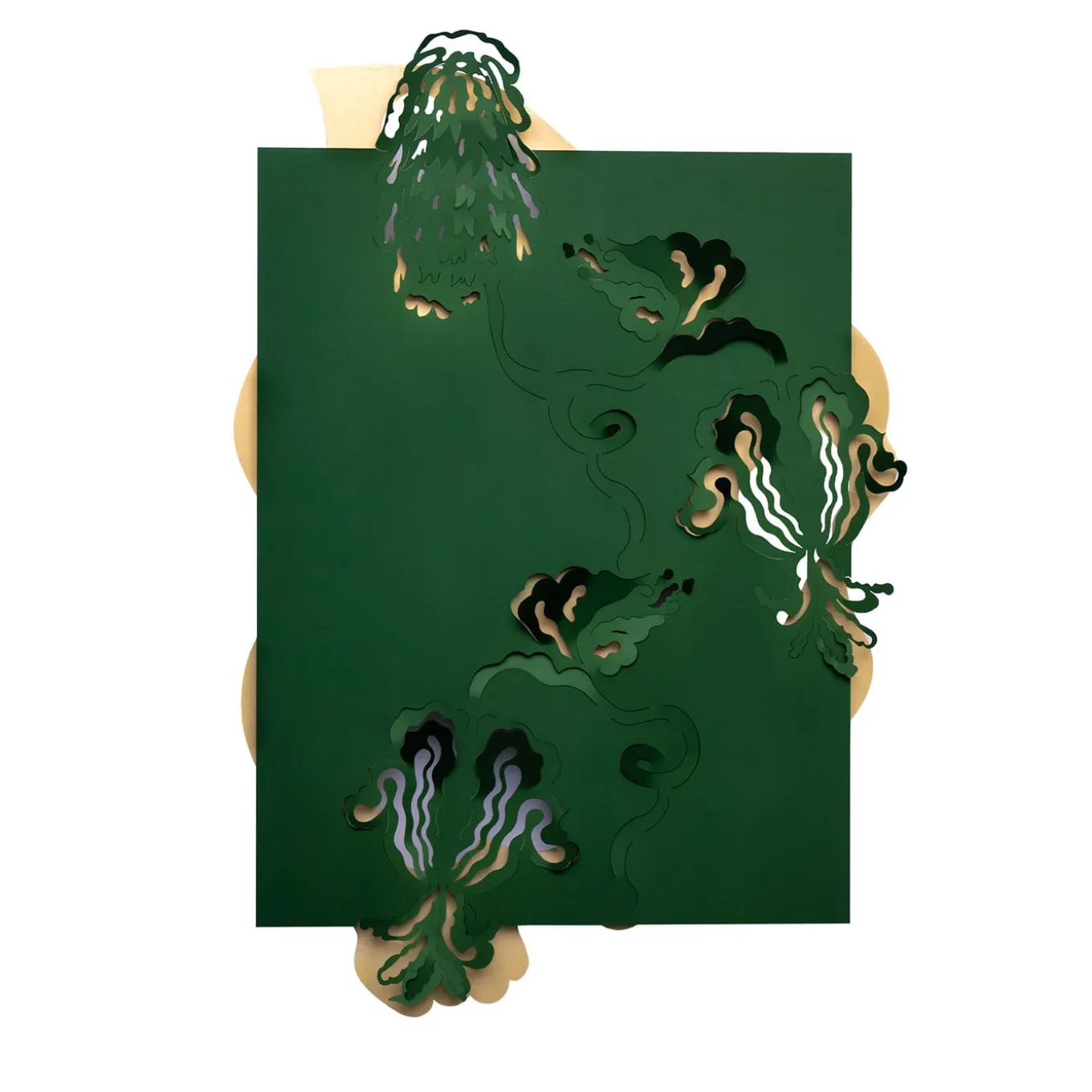 A splendid tribute to the myth of Love and Psyche, this spectacular artwork is a unique wall sculpture from an exclusive series designed by Matteo Cibic. Handmade of metal, it features green and gold lacquers, an elegant and timeless combination, the ideal complement to a refined contemporary interior. Please consult the Concierge for further information.