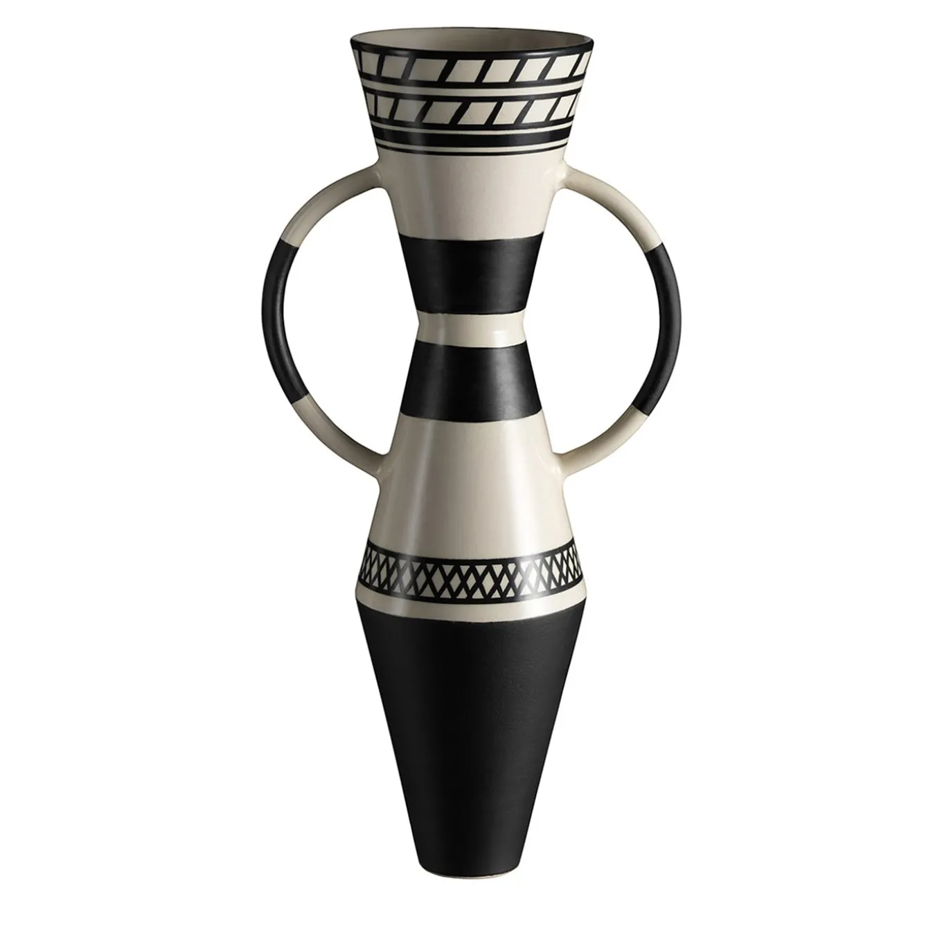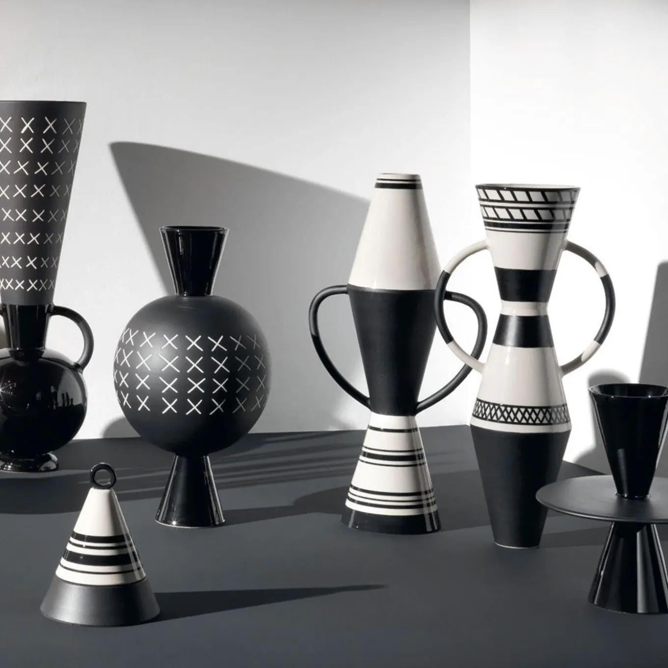 Conical and spheroidal vases play with lines and crosses in a black-and-white ritual. Clay vase, hand thrown, with clay handles. Matte black glaze finish for the base and handles, white engobe decorated black with transparent glaze for the body. Designed by Ugo La Pietra