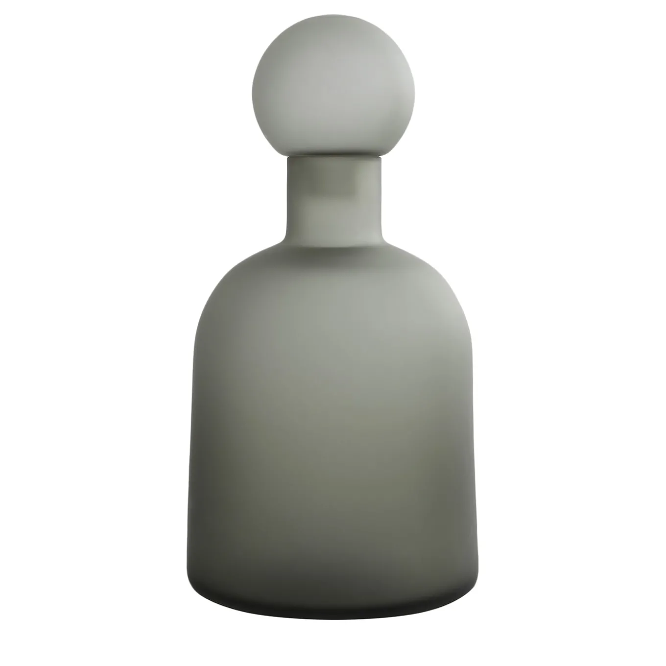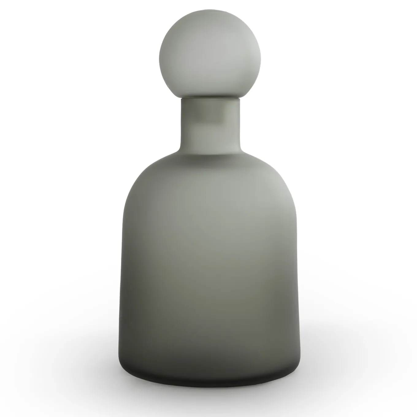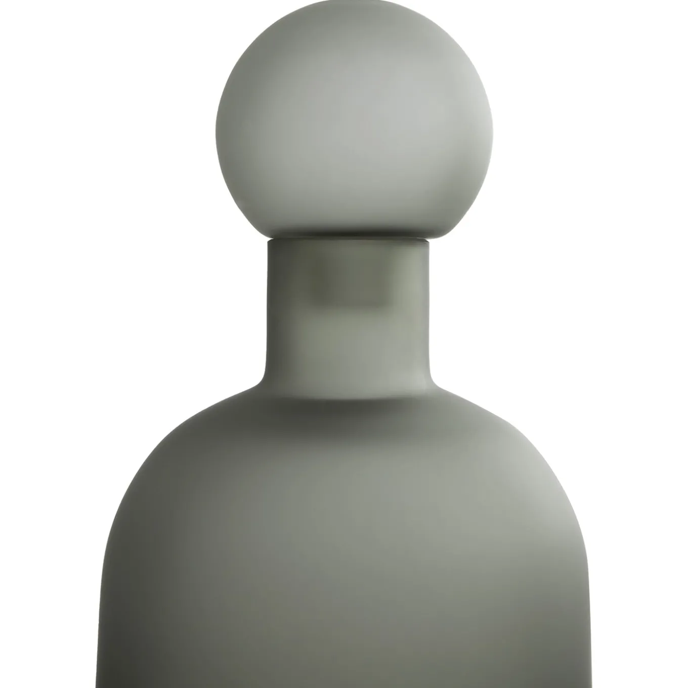 This elegant mouth-blown Murano glass bottle is a one-of-a-kind piece distinguished by an acid-etched look that emphasizes the shades of its gray silhouette. Defined by simple and harmonious lines, it actualizes an exquisitely modern reinvention of a design popular in the ’70s. Completed by a spherical lid, the piece also comes in an amber-toned version.