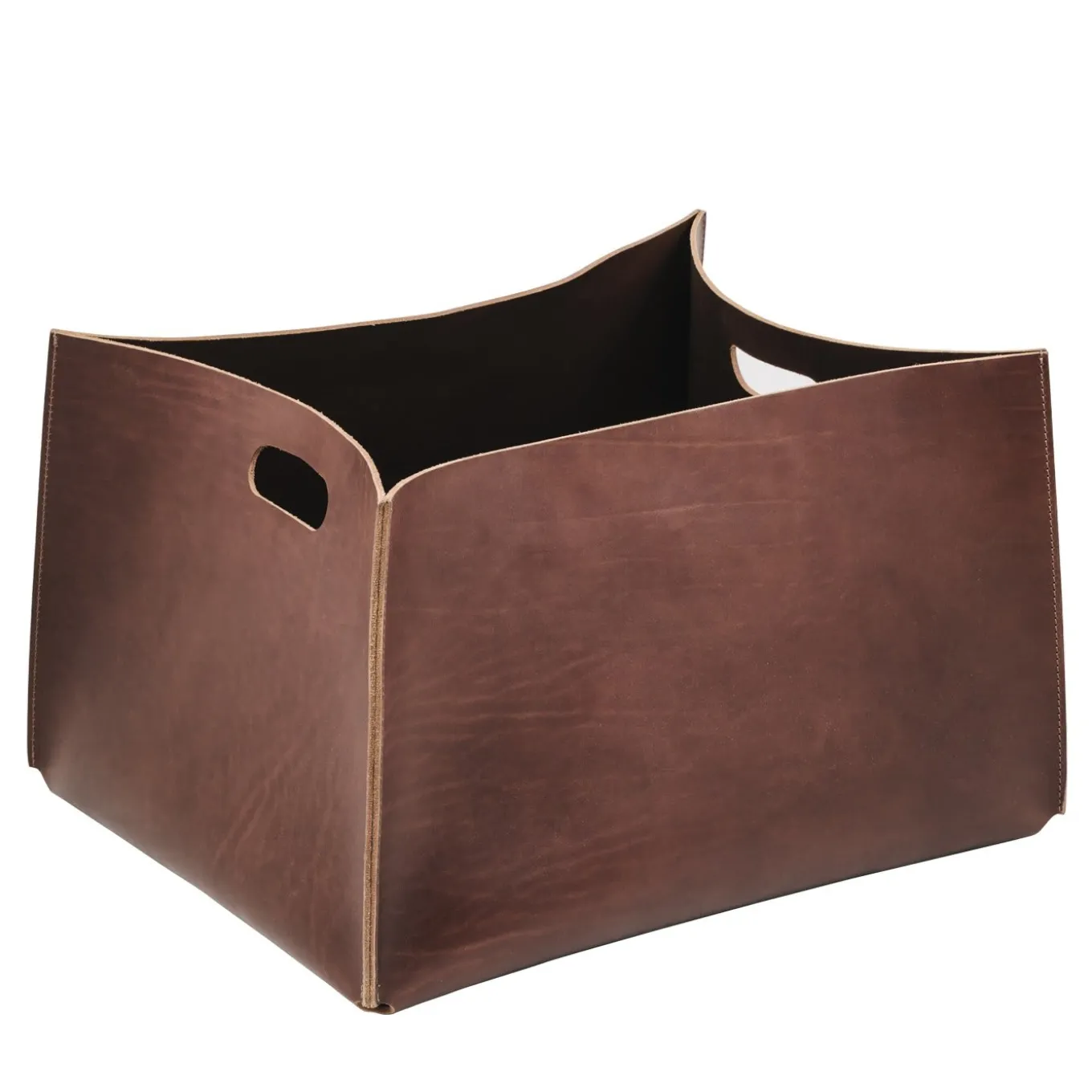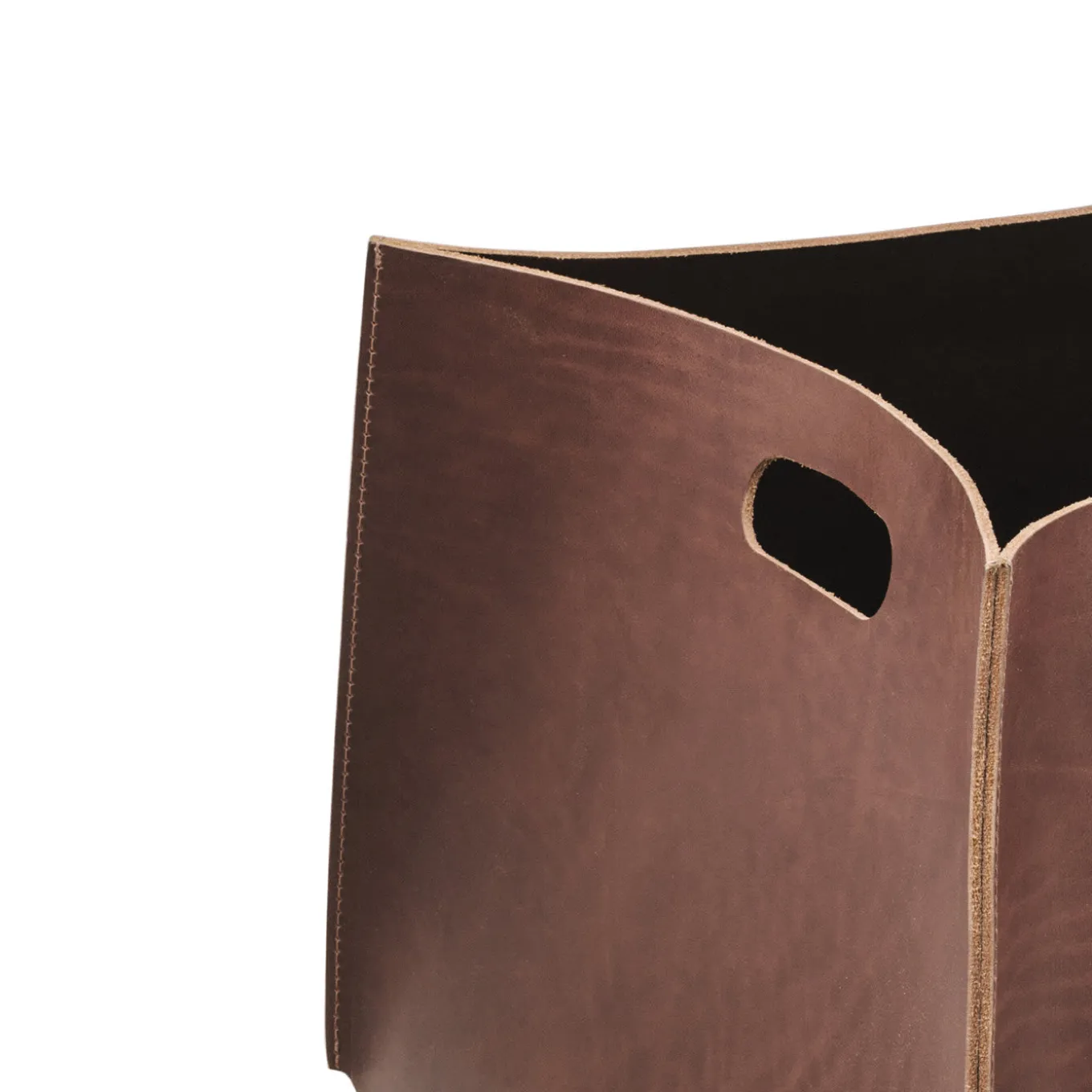 This exquisite storage basket is made entirely in saddle leather, a very fine leather that was dyed using vegetable pigments in an elegant shade of brown, producing a soft and durable texture. The loose rectangular shape is versatile and its design is timeless. These characteristics make the object suitable for any decor and a precious addition to any room in the house. Either alone, or paired with other baskets from the same designer, this object will enhance any decor.