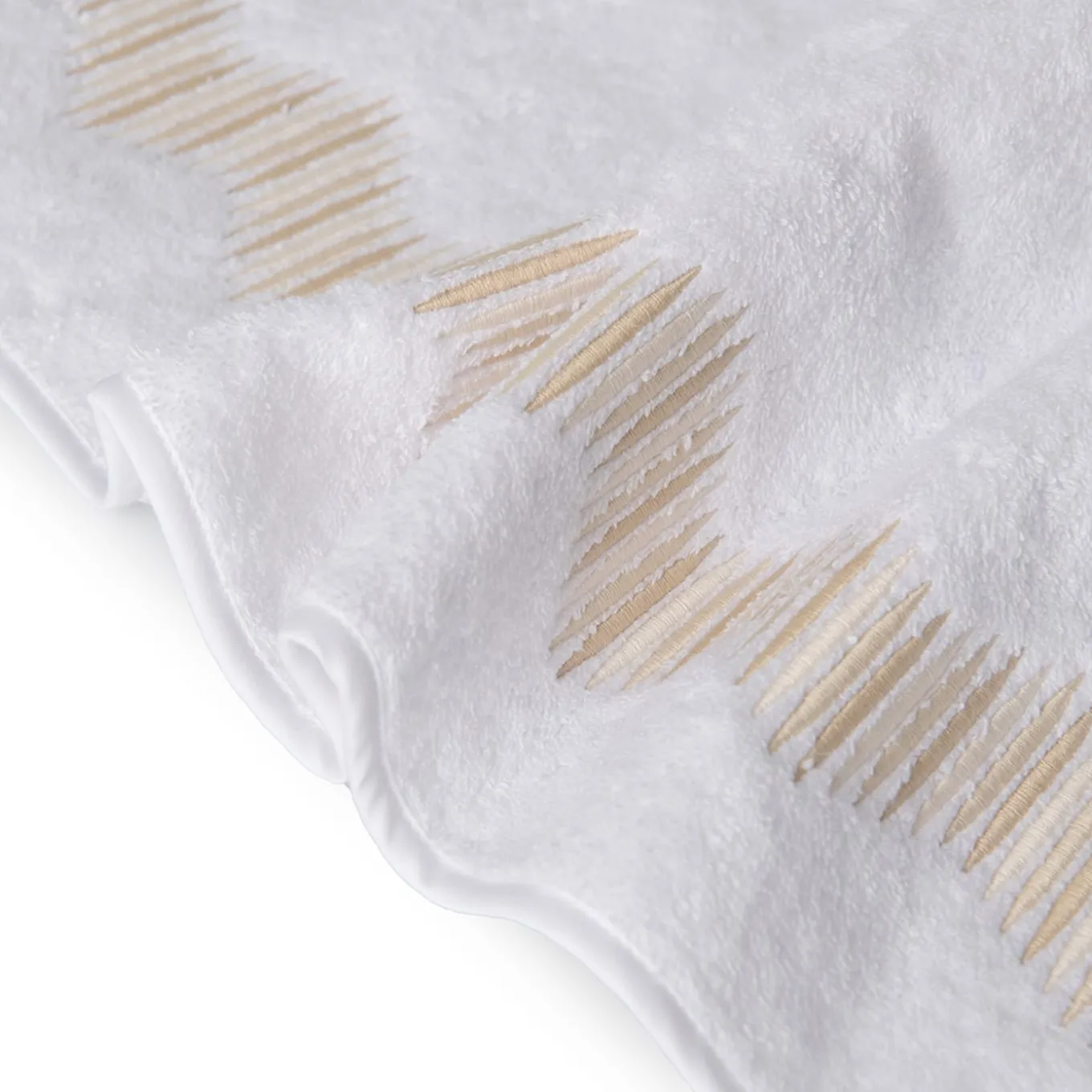 Deftly handcrafted of first-rate white terry cotton, embellished with a refined embroidered composition of three different shades of beige, this set of guest towel (40x60cm), hand towel (60x100cm), and bath towel (110x100cm) will make for a precious and elegant accent to both classic and modern settings of refined style.