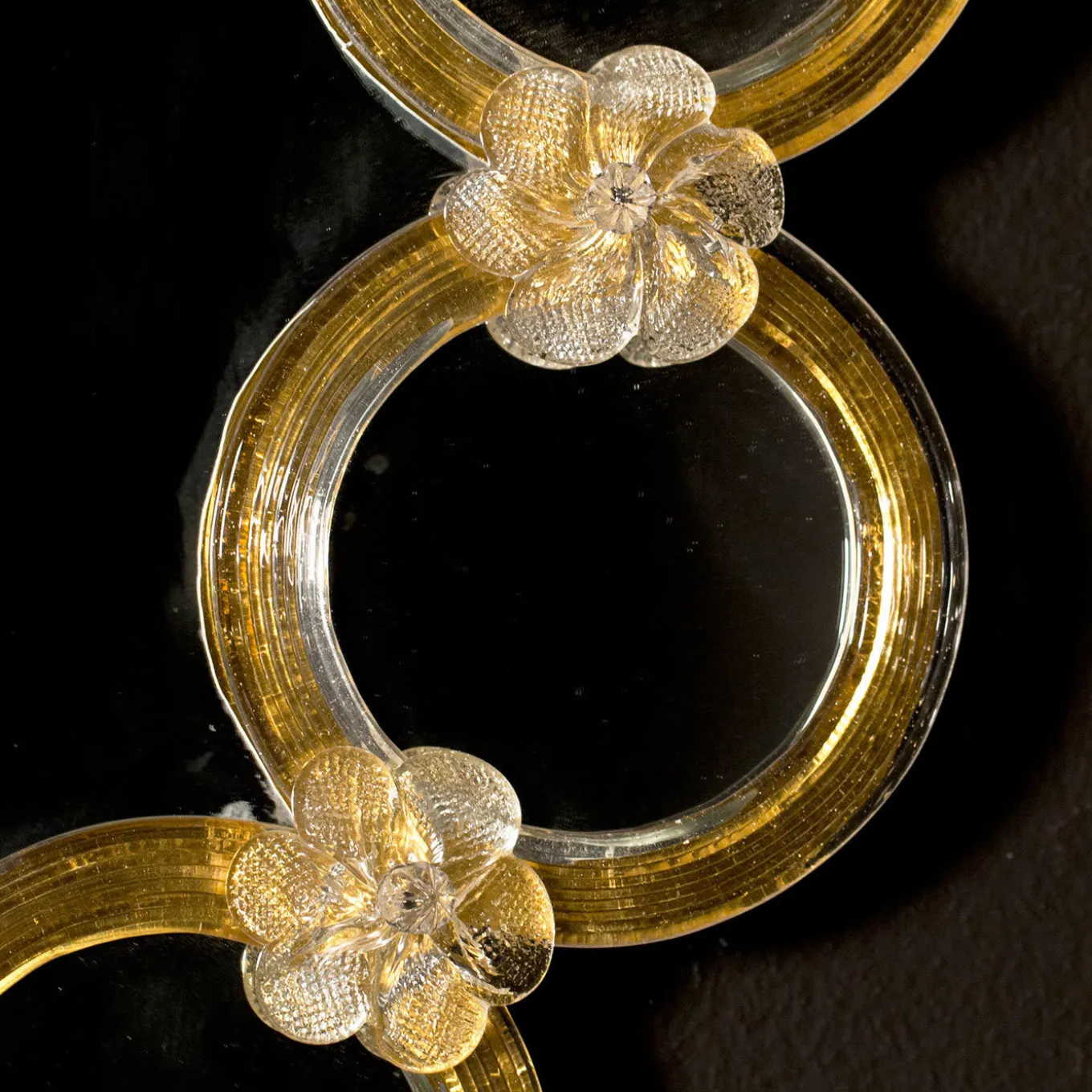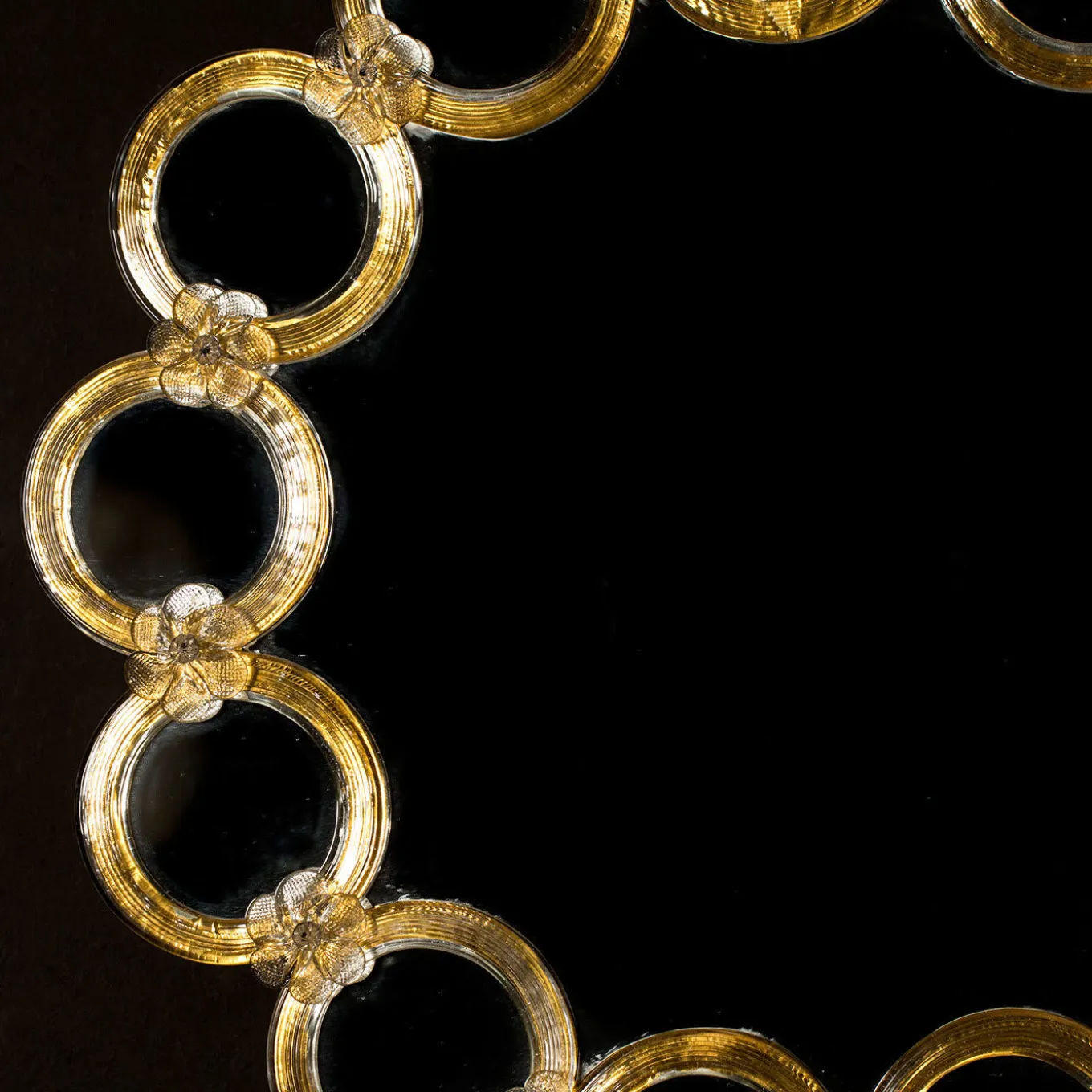 Golden Murano glass rings make up the frame of this graceful round mirror by Ongaro e Fuga. The décor is welded to the wood base panel thanks to detailed glass flowers joining each of the rings, thus, giving a sense of traditional in a rather modern design. This piece adds the right amount of glamor to a small space.