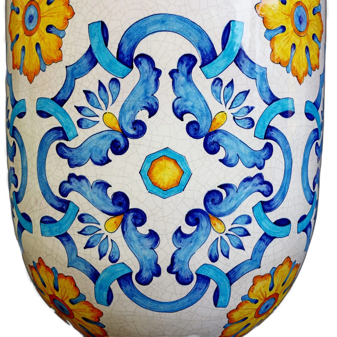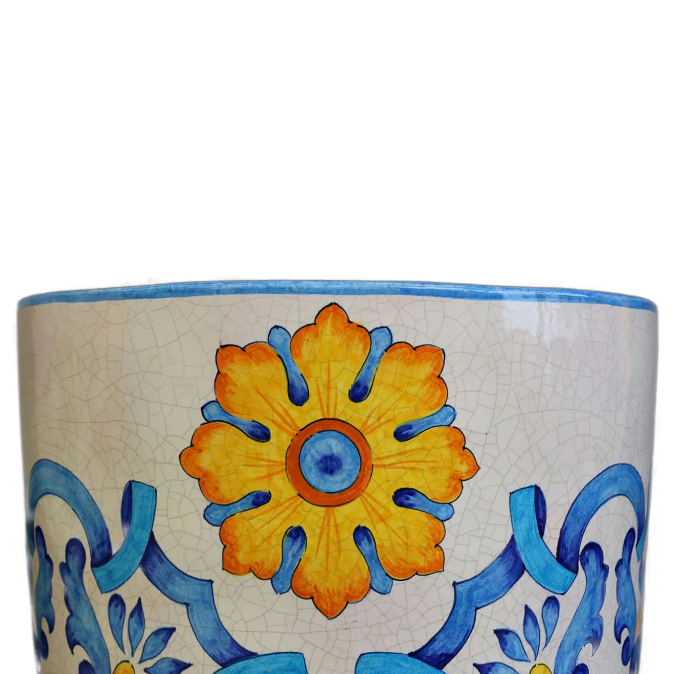 Traditional Sicilian patterns merge with elements from local flora in the enthralling decoration minutely painted on this precious ceramic cachepot. Stunning for hosting floral arrangements or as a standalone decorative piece, it is a testament to artisan pottery mastery with its meticulous patterns enhanced with vibrant glazes.