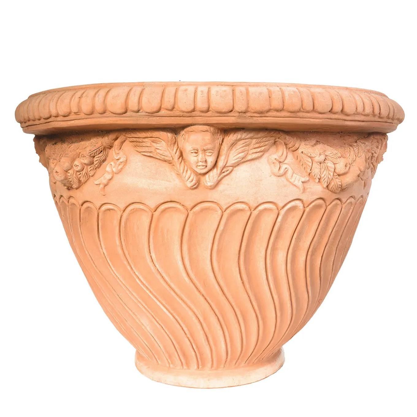 This exquisite vase exemplifies the value of handcrafted terracotta tradition from the Tuscan town of Impruneta. Marked by a classic V-shape, it sports sinuous, channeled details guiding the eye to the garlands and angels’ faces that embellish the section below the rim. Its frost-proof nature makes it suitable for both indoor and outdoor use. Potential differences from the pictured item are to be expected and treasured. CAT certified