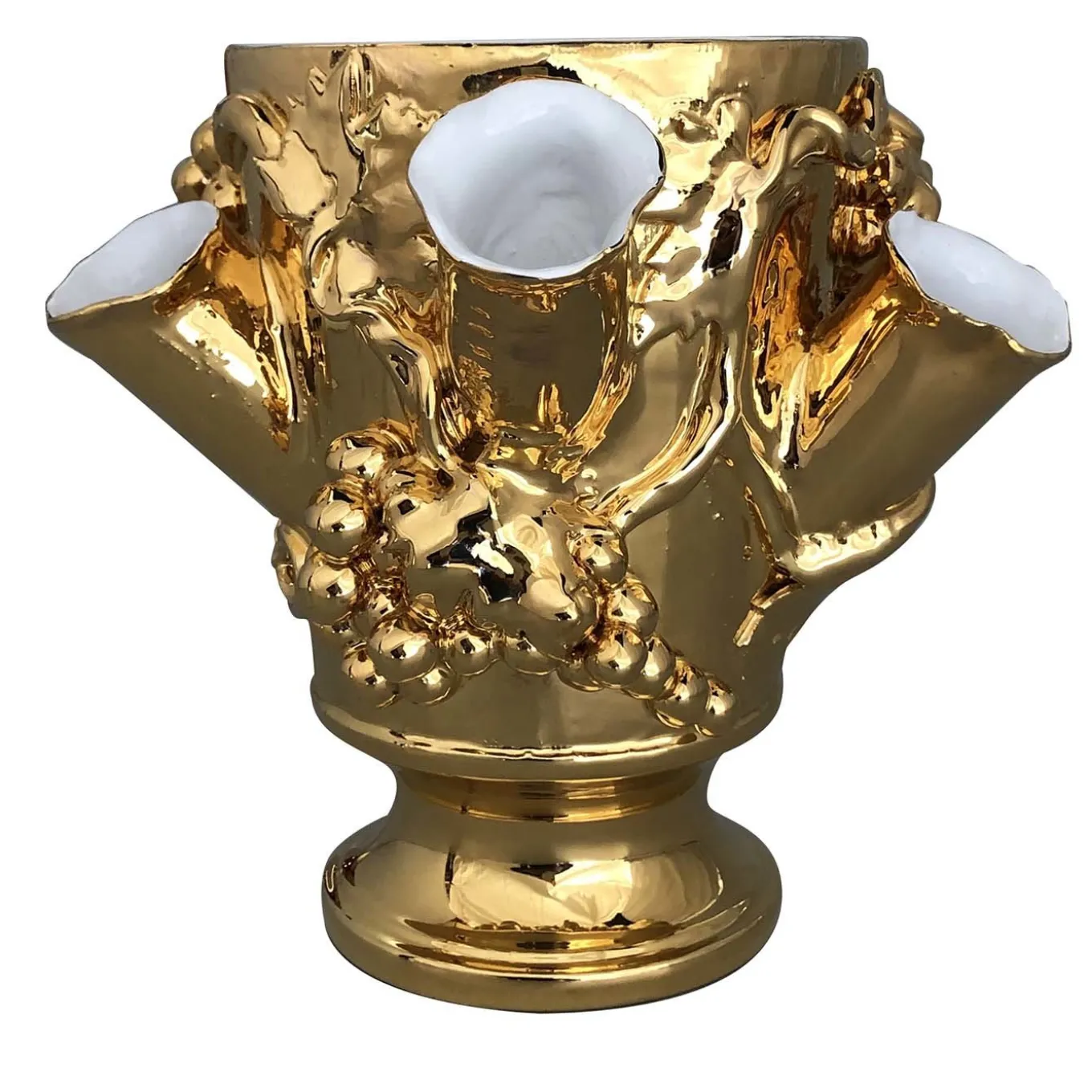The stunning Anghiari Vase features 5 openings with a large central vase and has been handturned in white terracotta and meticulously shaped by hand. Inspired by an ancient 19th century vase found in the family country home, it is finished in a gold glaze with irregularities in the tendrils and grapes design, attesting to its authenticity.