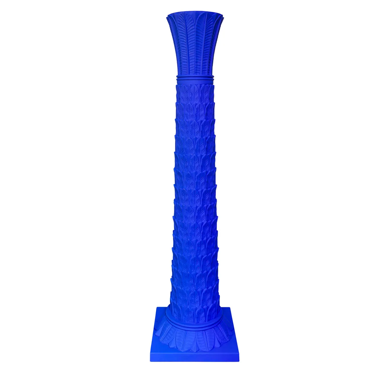Anne decorative column combines modern techniques with ancient carving traditions. Inspired by 1920s art deco columns with Renaissance and ancient Egyptian motifs, it features detailed hand-finished carvings requiring a week of craftsmanship per piece. Its deep blue matte finish, inspired by Nouveau Réalisme, offers a velvety texture that demands careful handling. The column is stable but sensitive to seasonal wood movement, best kept indoors and away from heat or moisture. Use caution: do not push, climb, or lean on it.