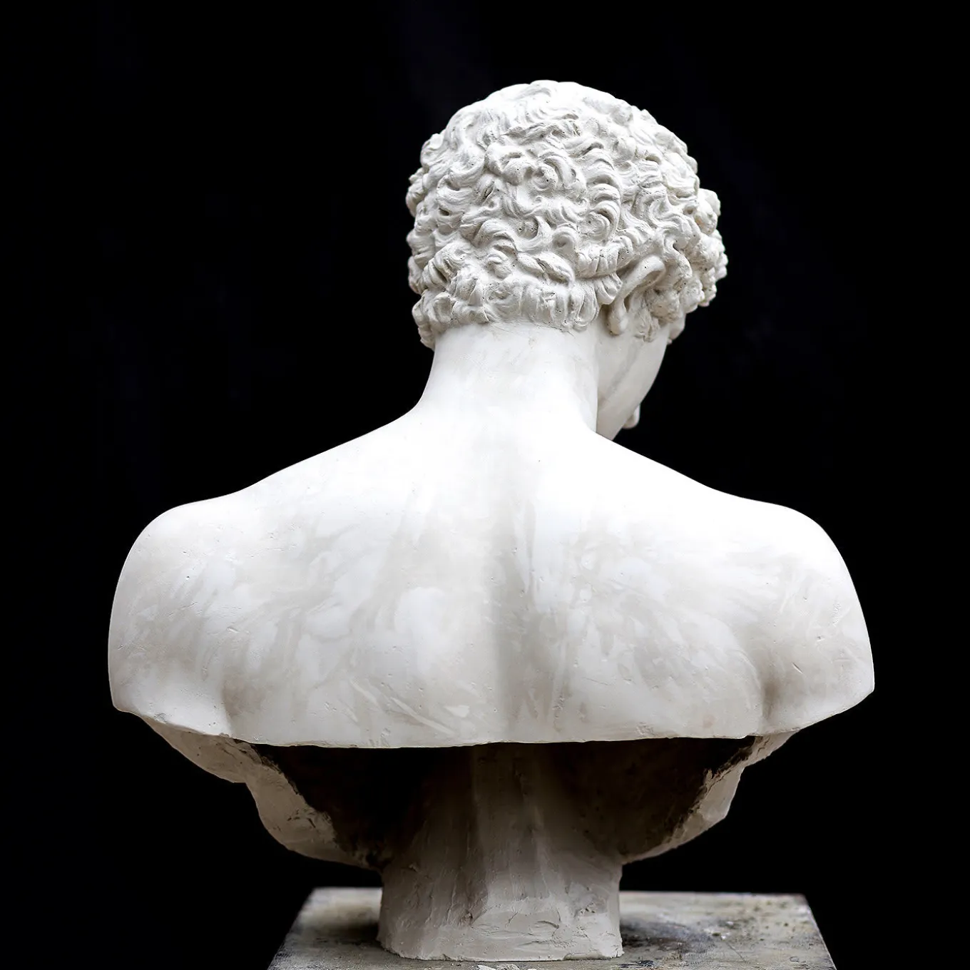 The elegant features of the young Antinous, a favorite of beloved Roman emperor Hadrian, are masterfully captured with exceptional richness in this plaster bust of the ancient Greek hero, a masterpiece created by the artisans of the Romanelli Gallery in Florence. The lifelike details of his handsome face, with a straight nose and thick, curly hair, are depicted in a melancholic expression perhaps reflecting on his premature death before his 20th birthday.