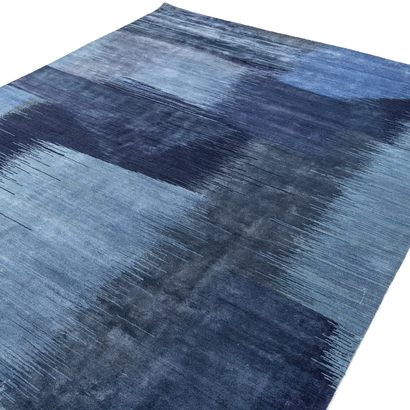 This hand-knotted rug in Antique Blue and Denim Blue captures the fluid interplay of light and shadow. Crafted from 53% hand-carded wool and 47% bamboo silk, it offers a soft, painterly effect. The design of the rug invites quiet contemplation, drawing the eye into intricate details before unveiling its grand, flowing presence. A tapestry of shifting tones and textures, it evokes the lingering afterglow of a beautifully fleeting moment.