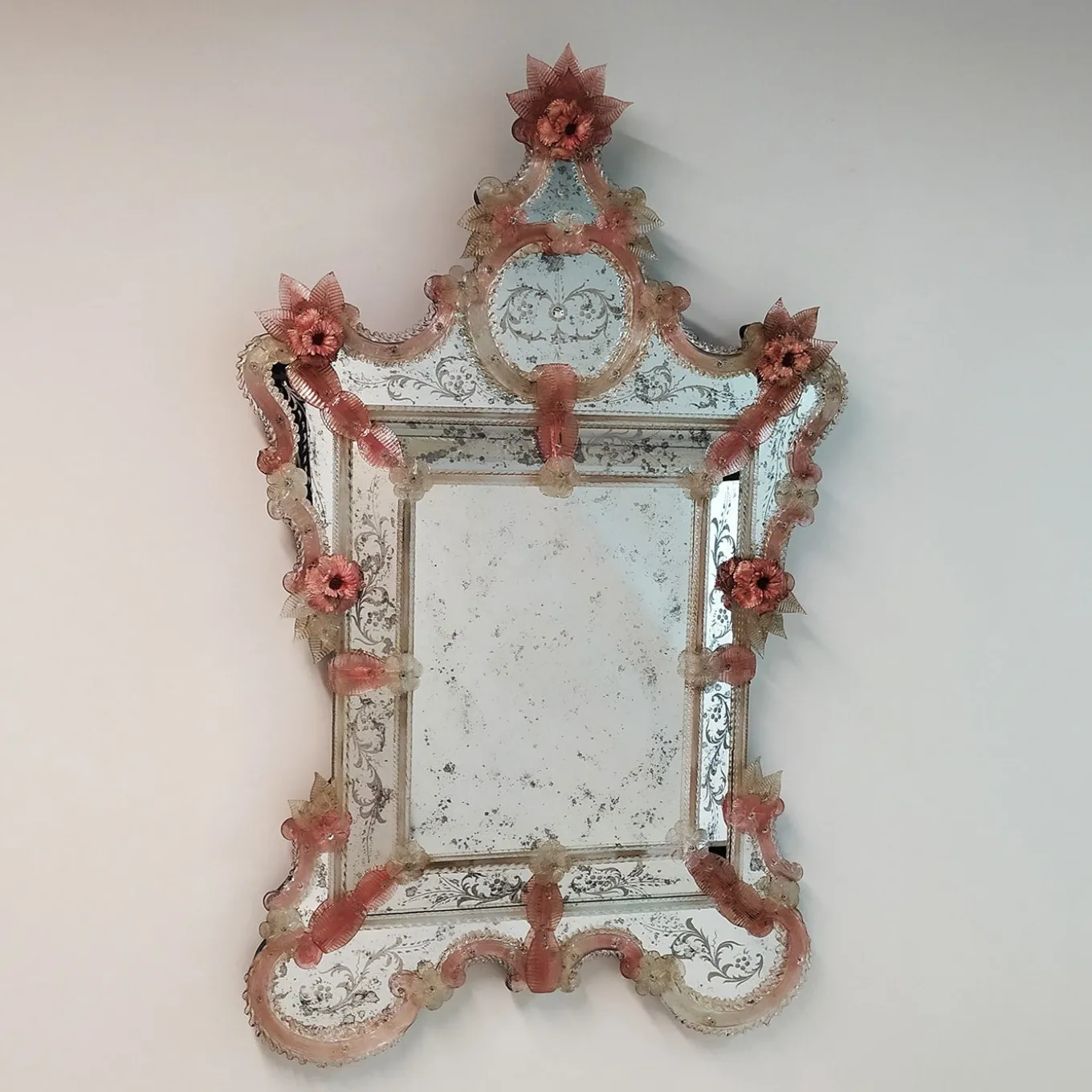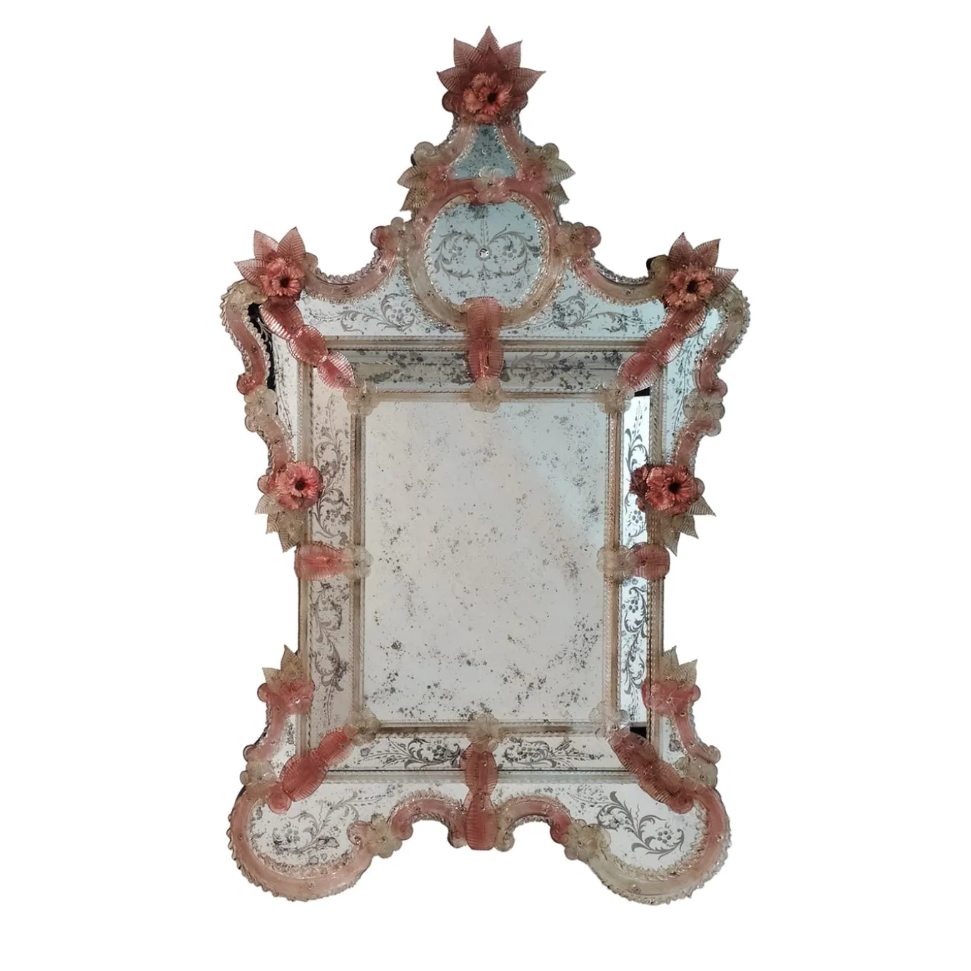 A masterpiece of Venetian elegance, this Murano glass mirror is a tribute to tradition and artistry. Hand-engraved with intricate floral motifs, its antique-finished glass is framed by soft pink Murano glass flowers, adding a romantic and delicate touch. Crafted by the renowned Fratelli Tosi, this timeless piece evokes the charm of a bygone era, making it the perfect statement for refined interiors seeking a touch of history and luxury.