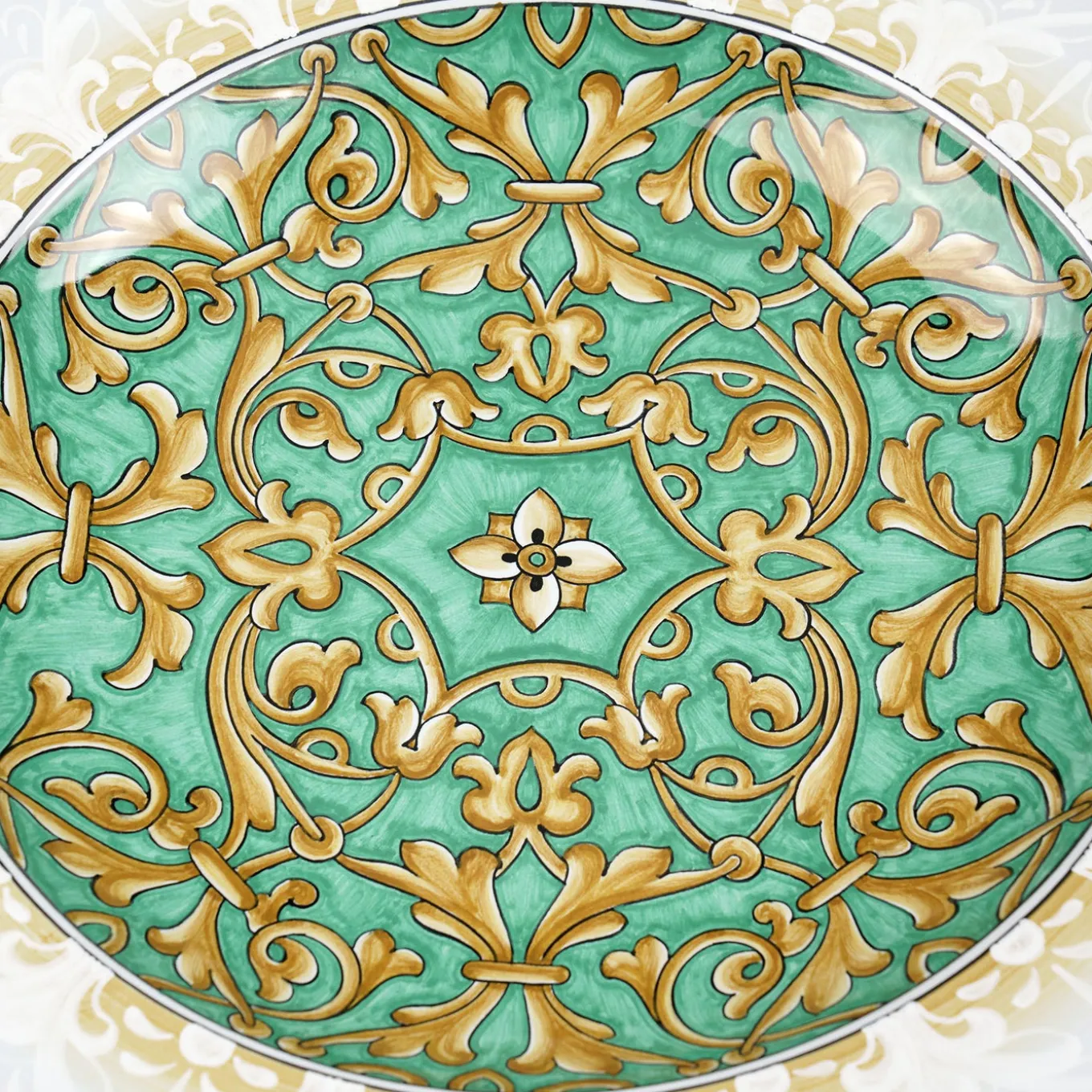 The Aquamarine Damask plate is crafted in majolica and hand-painted in a striking aquamarine and golden yellow duotone. Inspired by Deruta tradition and local church tiles, it features a wide raised rim decorated with delicate peacock feather motifs and cerium white shading. The central design showcases naturalistic raceme patterns radiating symmetrically from a hexagonal core. Fully handmade and hand-painted in Italy, this limited edition piece of 30 reflects exquisite artisanal craftsmanship. Slight variations may occur, highlighting its unique handmade nature.