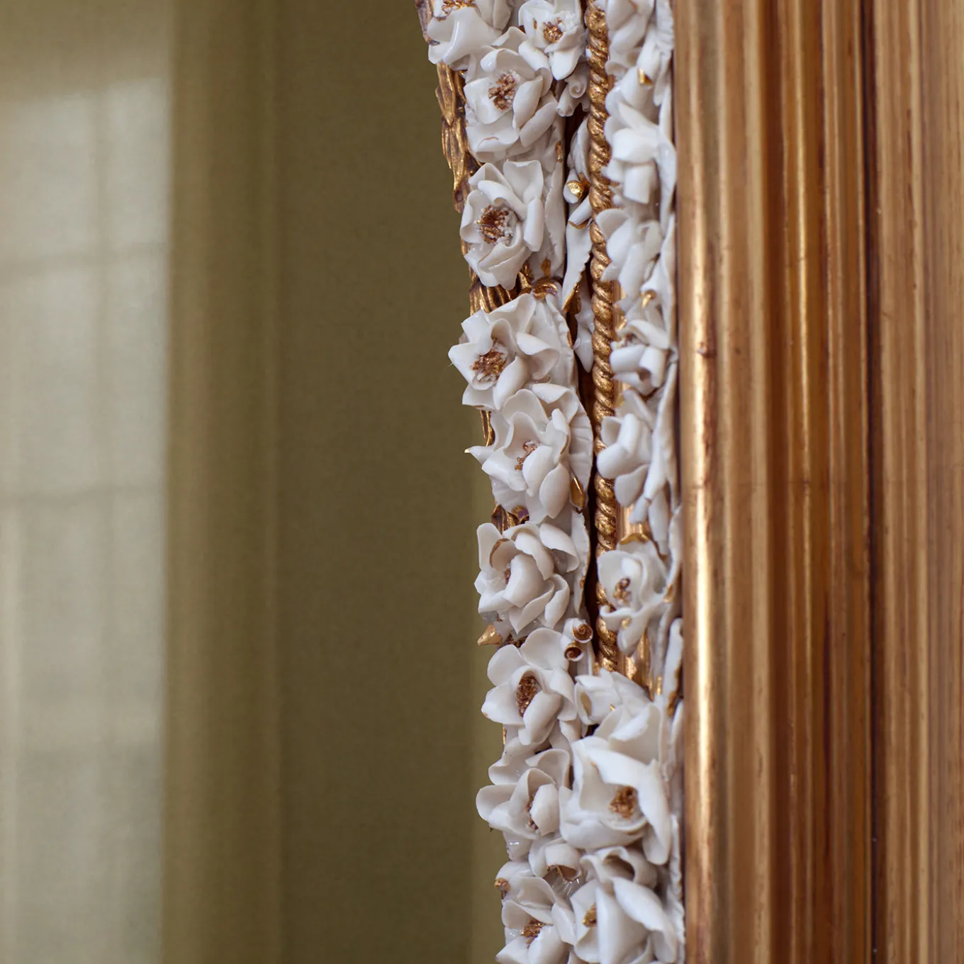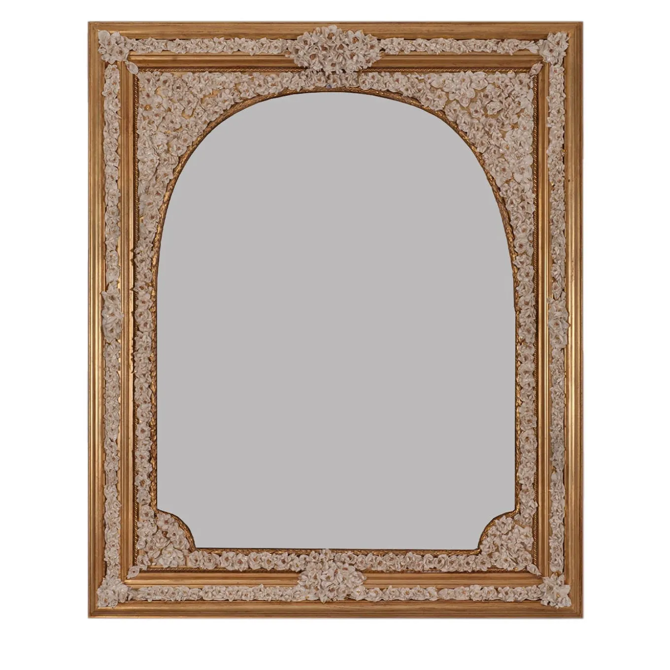 An arched mirror featuring a frame finished in an antique gold tone and entirely adorned with delicate Capodimonte porcelain flowers and buds. Each floral element is individually modeled and some petals and leaf tips are hand-painted with real gold, then kiln-fired to enhance their refined, luminous effect. The medium to large frame adds elegant depth and celebrates classic ceramic artistry. Custom sizes available upon request. Please contact the Concierge for more information.