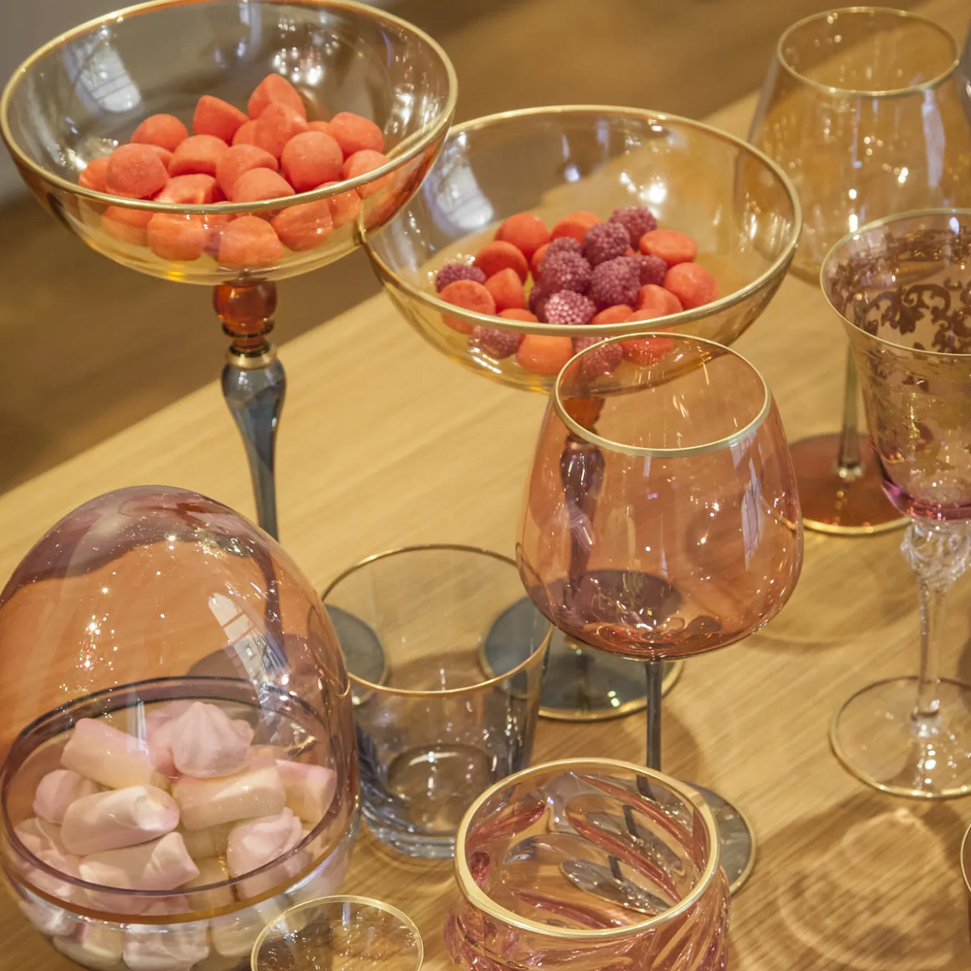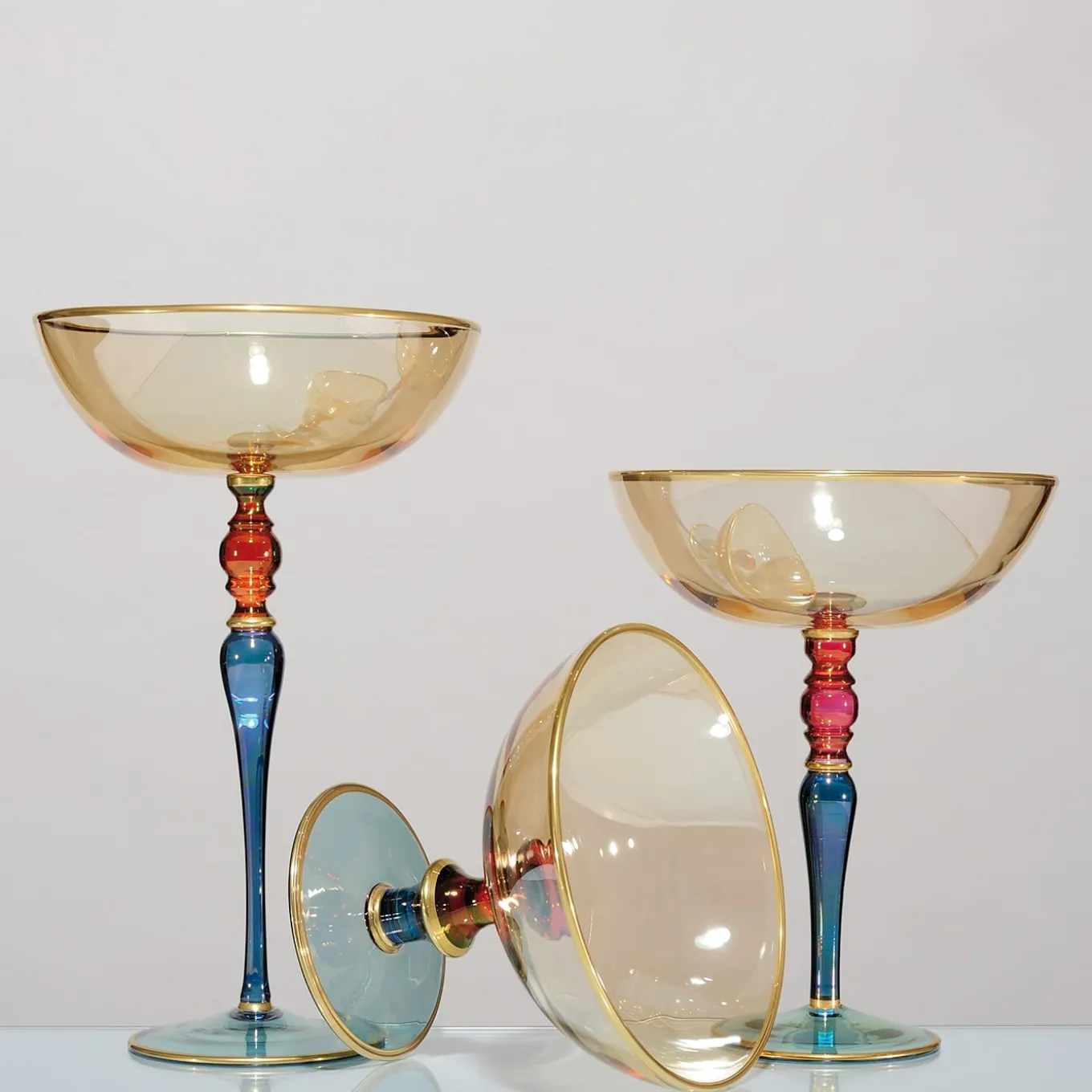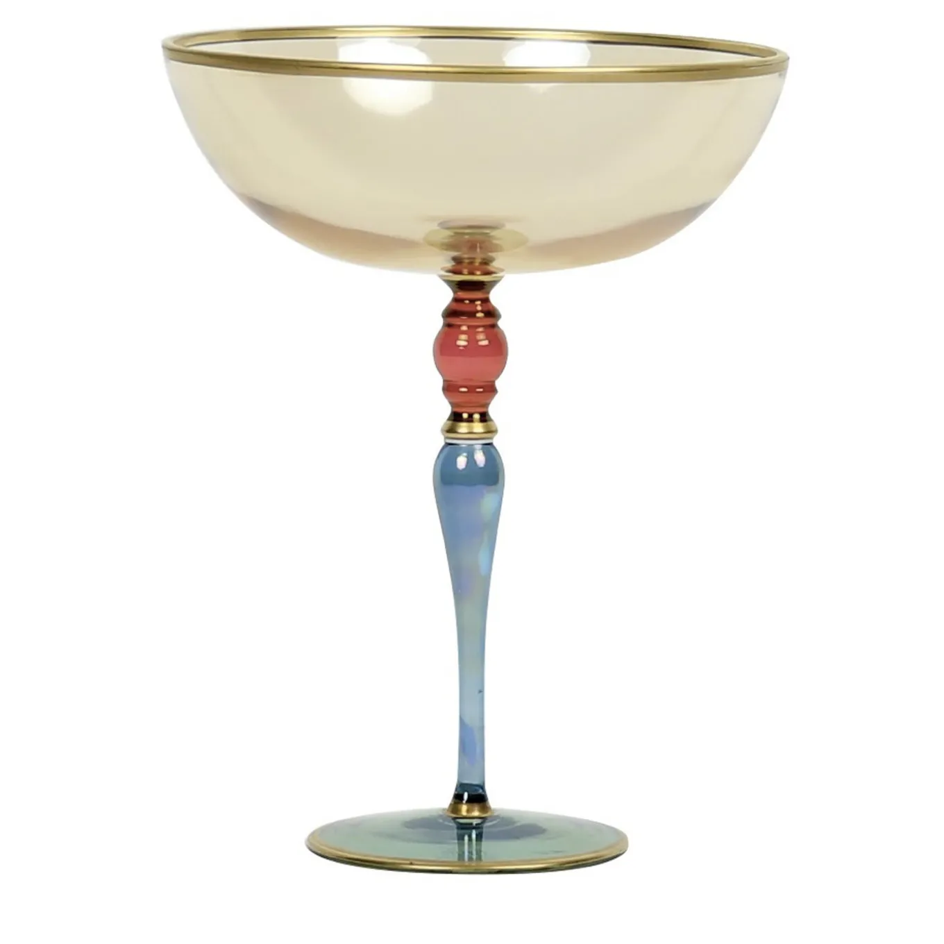 This magnificent cup can be a precious centerpiece or a decorative accent that will bring luxury and elegance to any decor. It was made in glass and features an elongated stem whose sinuous decorations are highlighted in blue and red, with a cup in a delicate amber hue. All colors are applied by hand. Accents in pure gold add a warm and sophisticated glow to the piece that, along with its exquisite craftsmanship, will enhance a living room, a dining room, or an entryway.