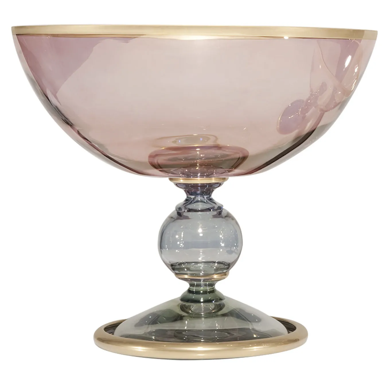 This magnificent piece can be used as a fruit bowl or centerpiece and will add grace and elegance to a dining table or even an entryway, thanks to its exquisite craftsmanship and the charming color combination. The body of the piece was mouth-blown and adorned with delicate hues that complement the precious rim in pure gold that accents its top and base making it a sophisticated object of functional decor.