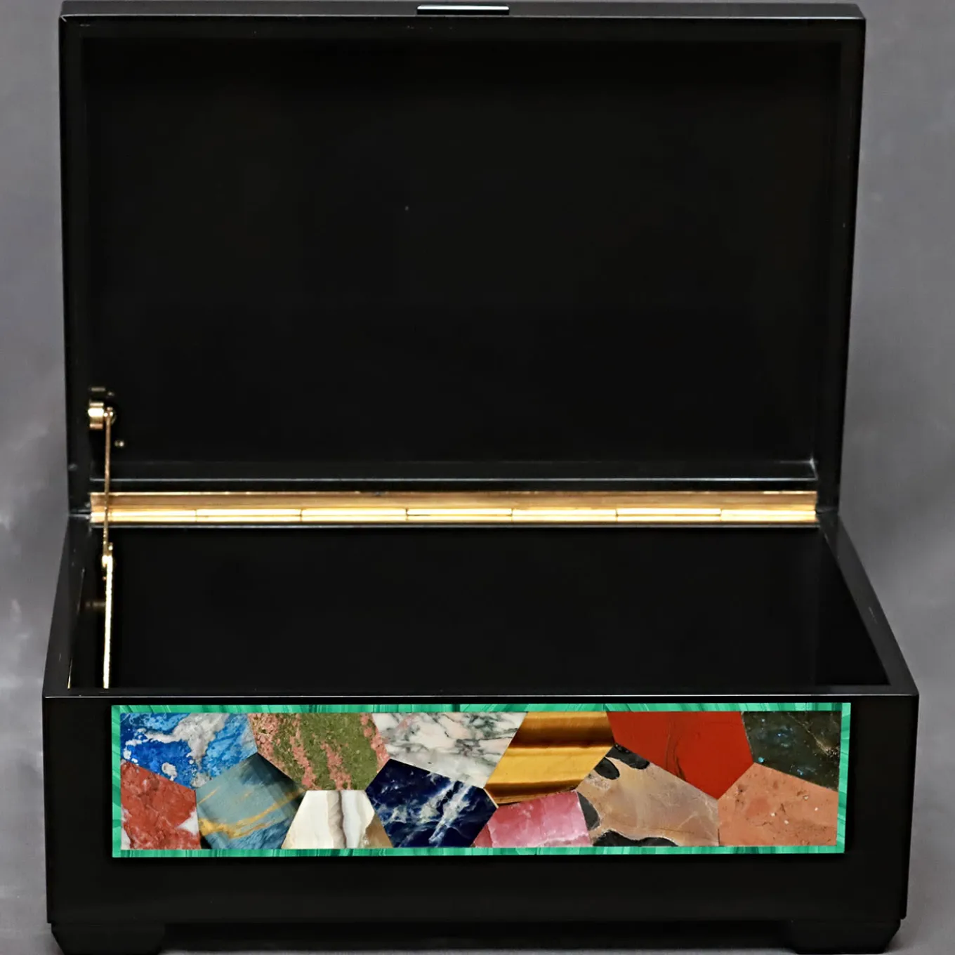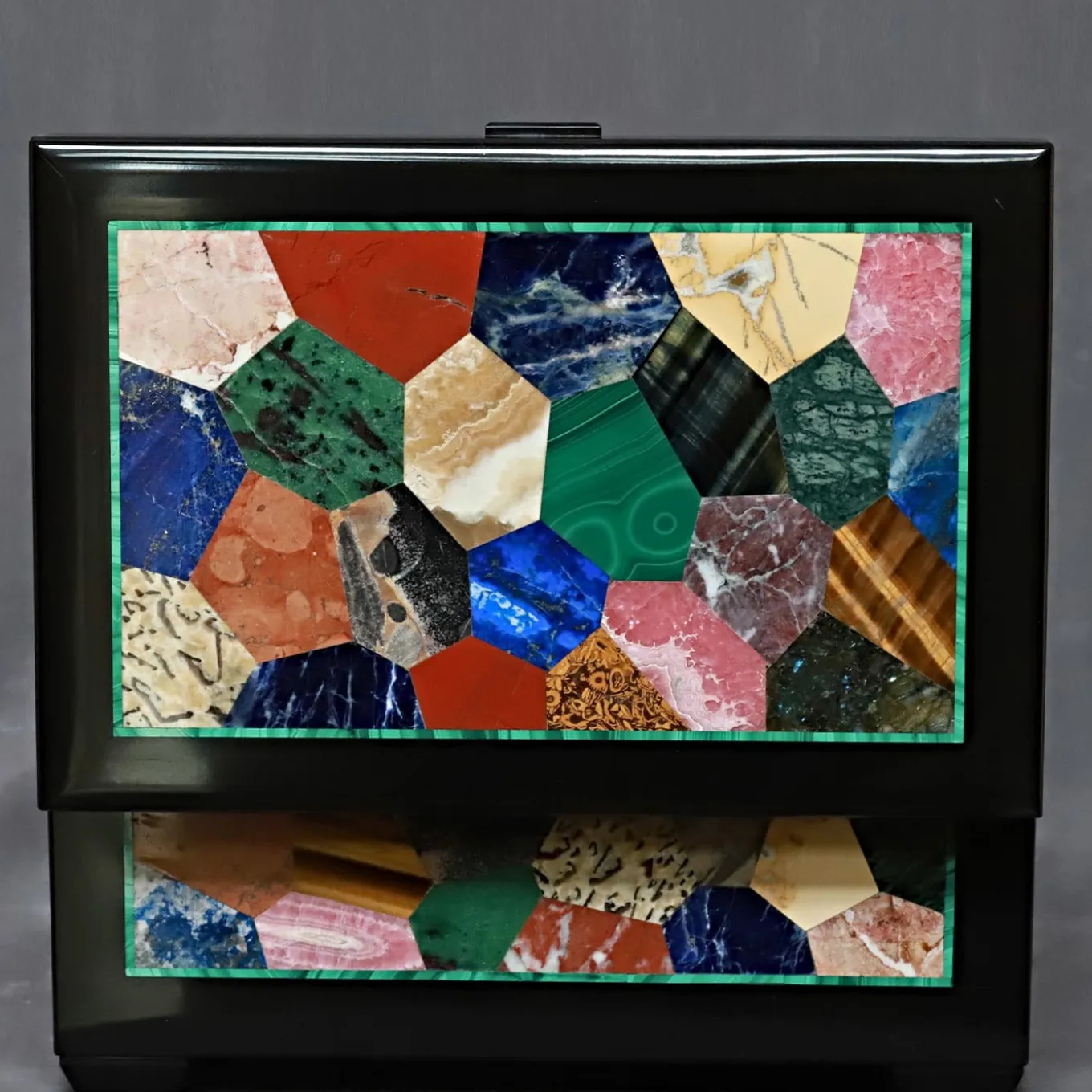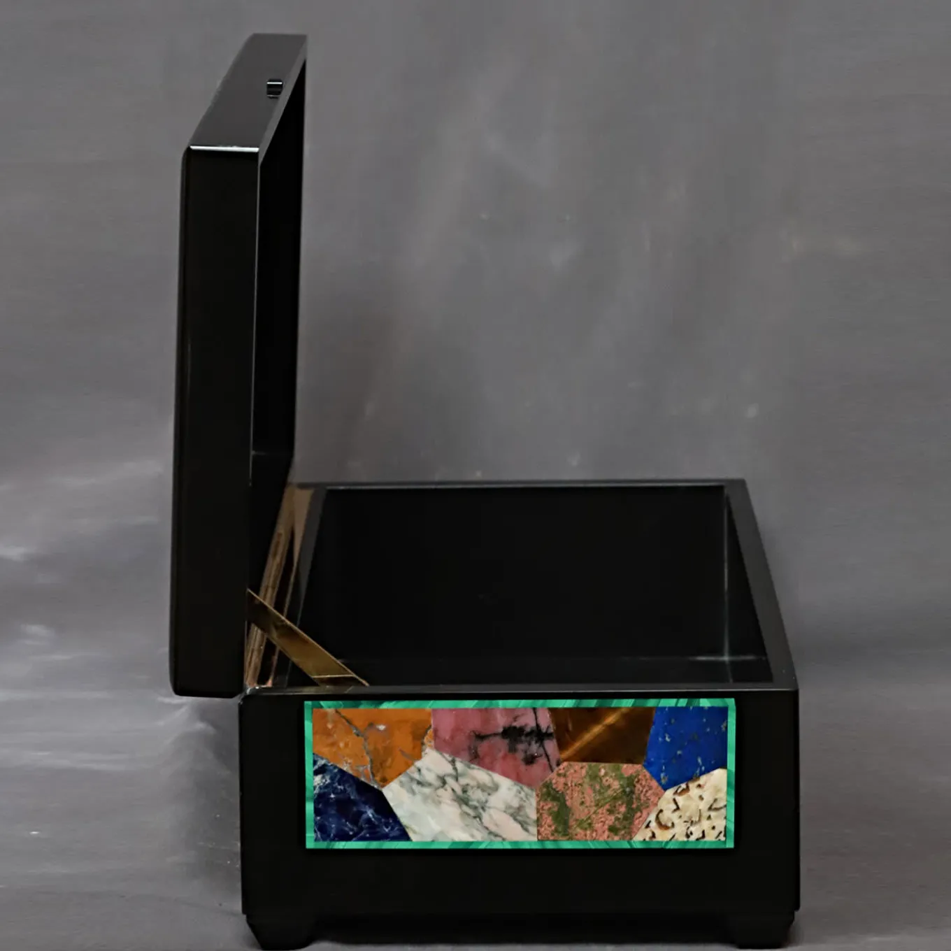 Precious memories impressed on polaroids or jewelry favorites will be luxuriously treasured within this rectangular-cut box. Black Belgio marble is featured to craft its general structure – feet included – while rhodochrosite, tiger eye, lapis lazuli, zoisite, bloodstone, and onyx create the Arlequin-style decoration on all sides, pattern outlined by a thin malachite frame.