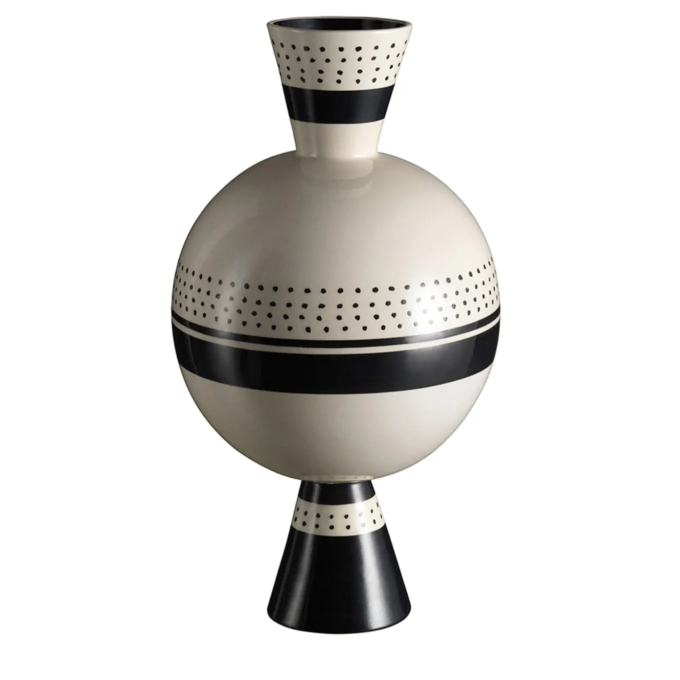 Conical and spheroidal vases play with lines and crosses in a black-and-white ritual. Clay vase, hand thrown. White engobe finish decorated black with a transparent glaze. Designed by Ugo La Pietra