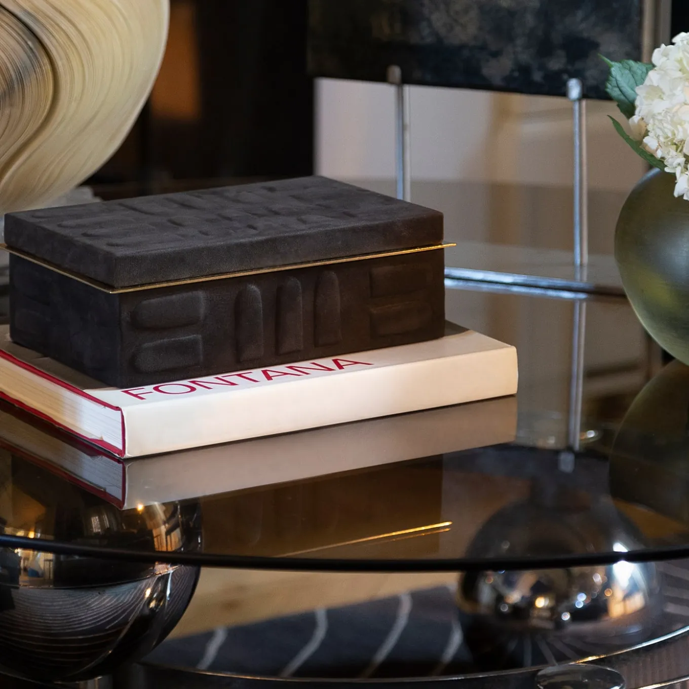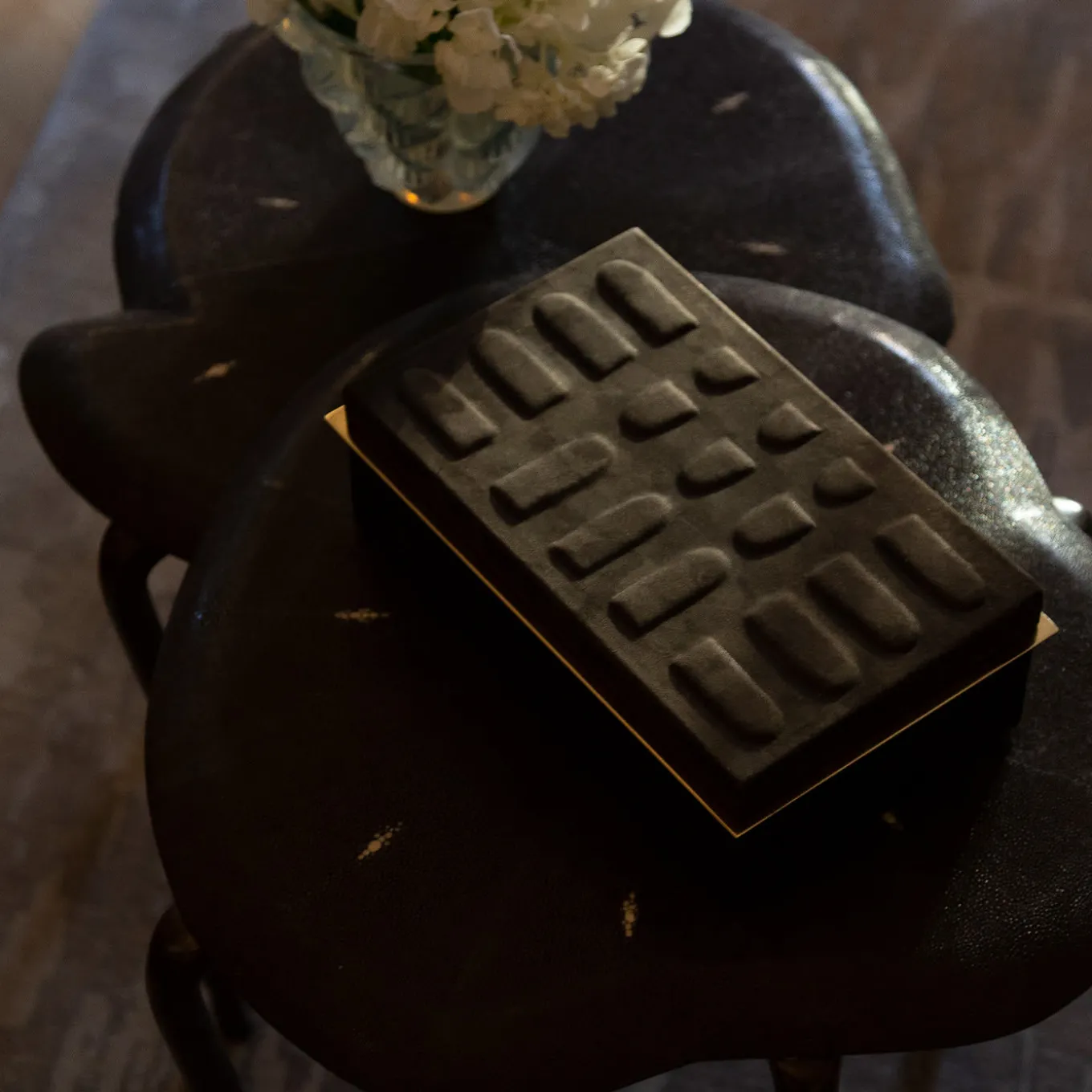 Asat is a masterpiece of refined craftsmanship. The solid Canaletto walnut structure of the body and the lid is covered in prized and highly textured Nubuck Leather enhancing the visual effect of the piece, soft to the touch and vibrant to the eye. Textures and symbols refer to the Bacabs Collection, placing the item among the kind homages to the pre-Columbian culture. The linear and minimalist brass insert counterbalances the sumptuousness of the piece, for an elegant and refined look.