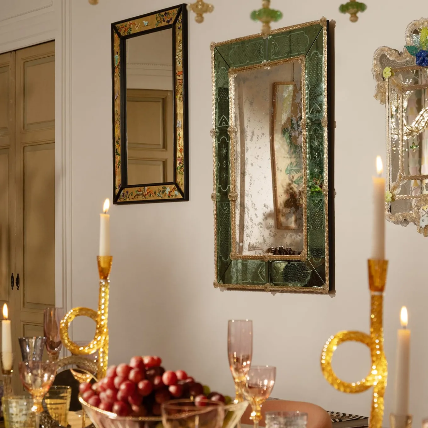 This stunning mirror is a superb decorative piece to add to any sophisticated interior. Its rigorous frame is adorned with a delicate decoration applied by hand on the mirror, rendering with masterful expertise a series of colorful flowers and running all around the rectangular perimeter. Either as an accent piece in a bedroom or powder room or as decoration to brighten up a living room or entryway this one-of-a-kind mirror will make an elegant statement.