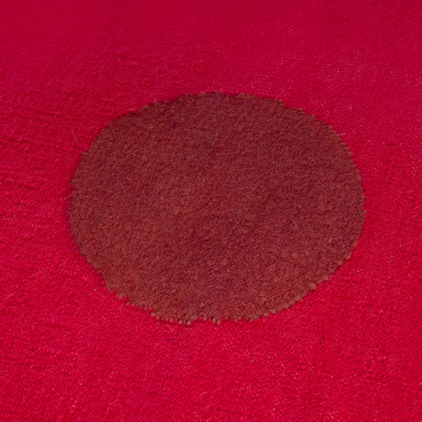 A kilim carpet featuring a deep red field punctuated by a centered darker circle, evoking the symbolic power of fire and a focused, contemplative gaze. This piece conveys themes of solitude and togetherness through its minimal and hypnotic design, adding both warmth and introspective depth to any space. Ideal for enhancing the aesthetic and emotional atmosphere of interiors. Design by Stefania Ruggiero.