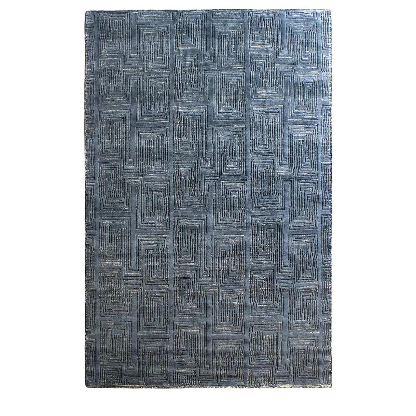 A blue carpet by an exotic look, inspired by the ancient Moroccan style and symbols. It is entirely hand-knotted from scratch using a mix of bamboo, wool, and cotton threads of different blue shades and lengths. This is the original characteristic that gives this item its dynamic and vibrant texture. Its dimensions can be customized upon request.