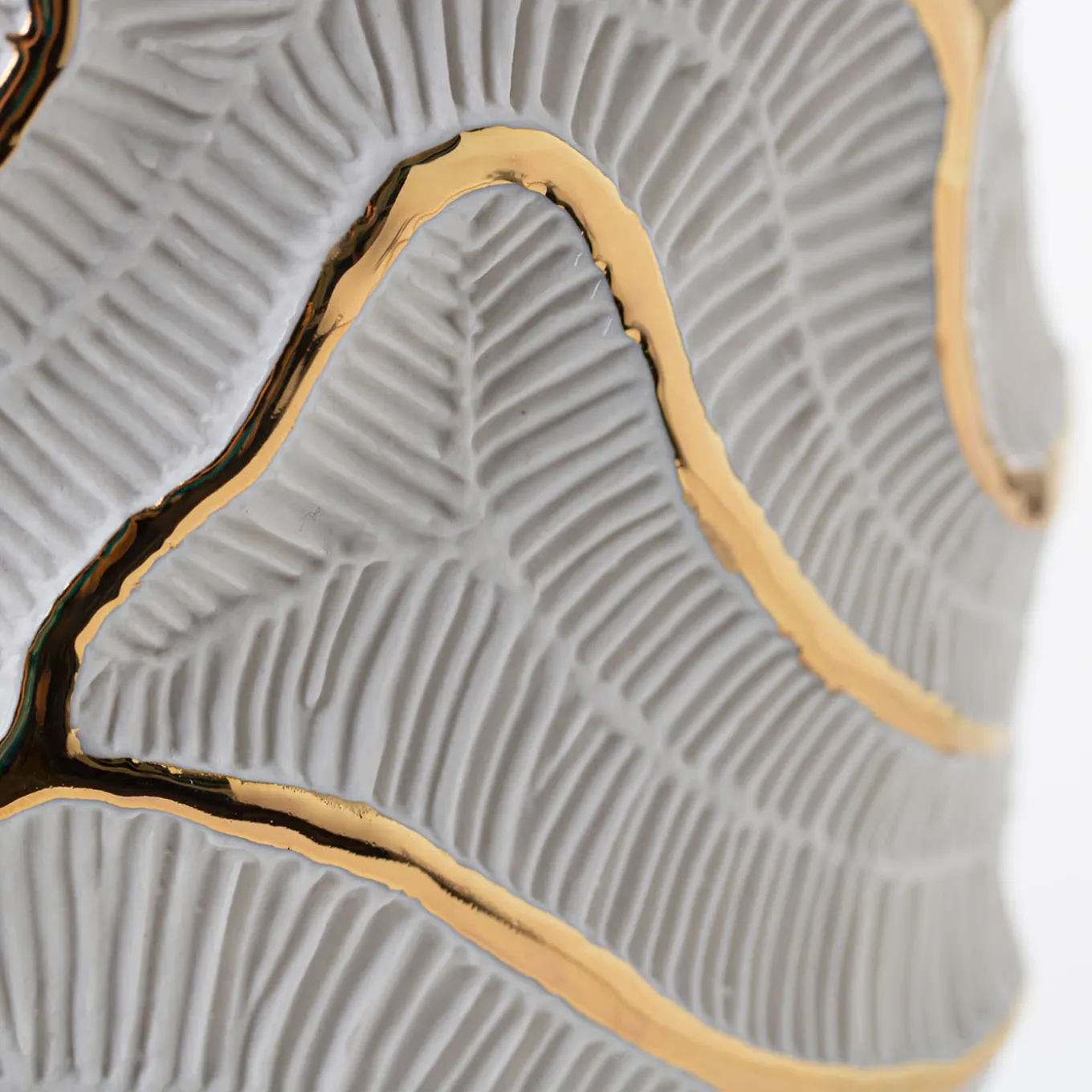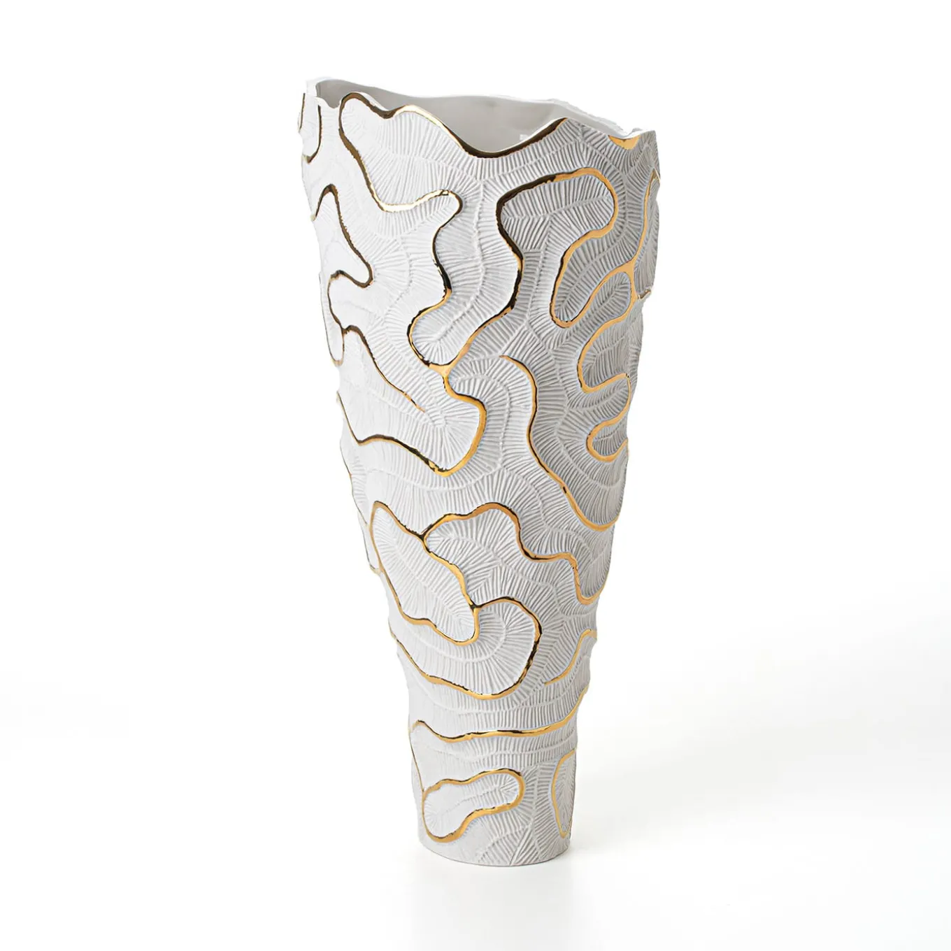A striking texture, symbolizing the fossils of madrepores, acts as a skeleton for this vase of the Fossilia collection. The stunning composition, the perfection of form and the accuracy in the details of the porcelain make this piece an exquisite objet d’art. The vase is embellished by the use of gold which has been applied by hand and fixed through an additional firing process.